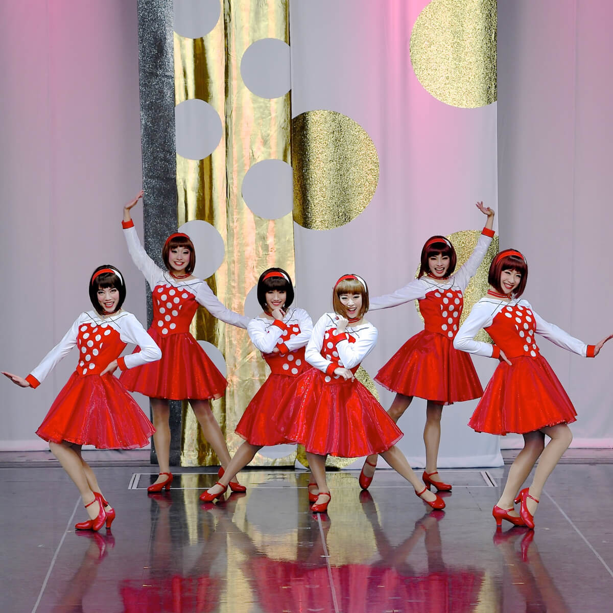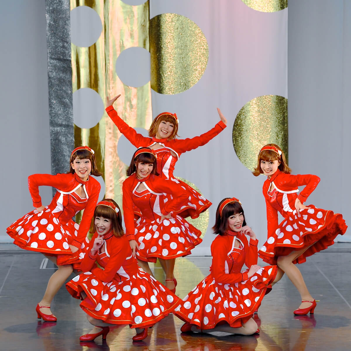 赤地に白い水玉模様のアイコニックなコスチュームで登場☆