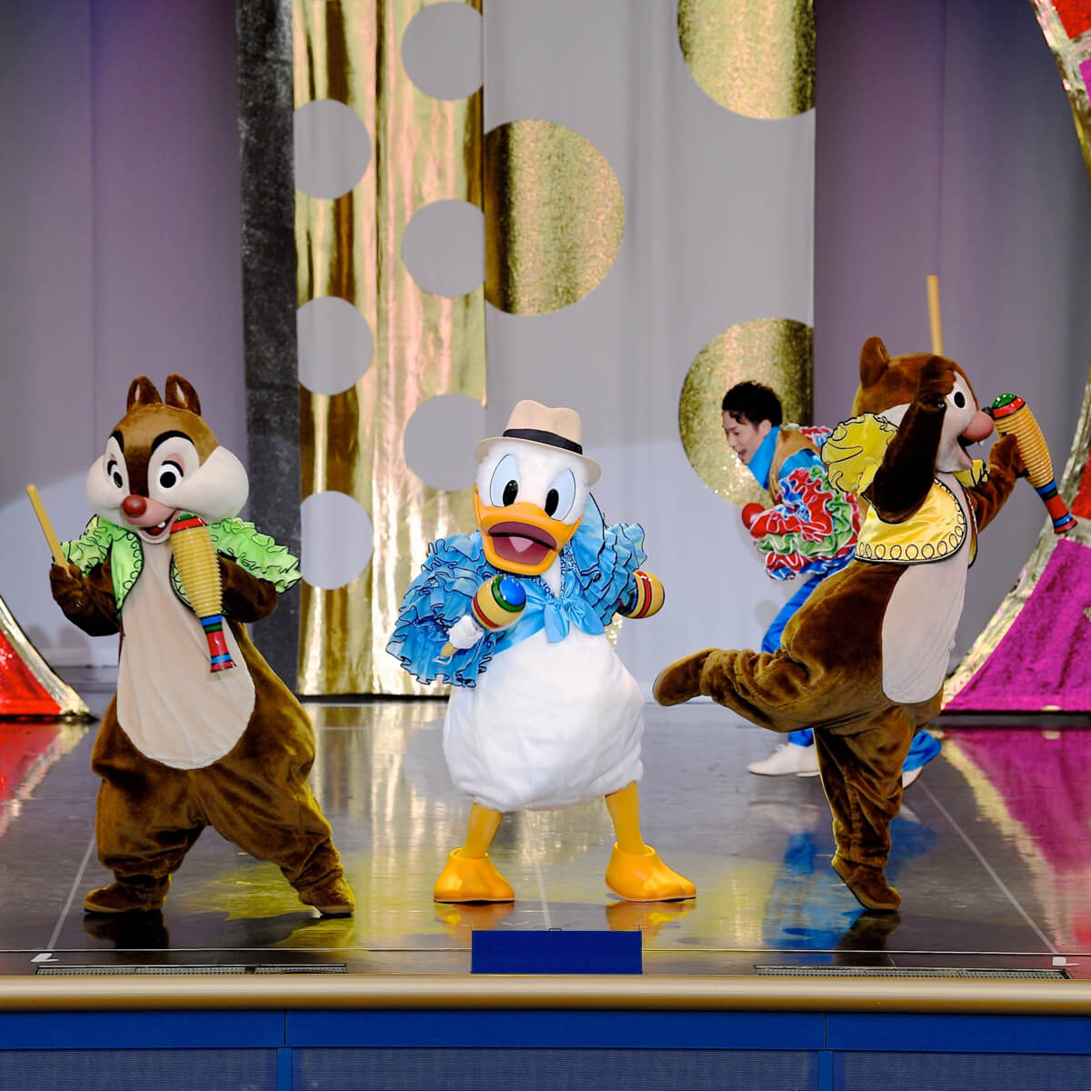 続いて、「ドナルドダック」と「チップ」「デール」が1996年から2000年まで行われていた『フィエスタ・トロピカール』をモチーフにしたコスチュームでステージを盛り上げます☆