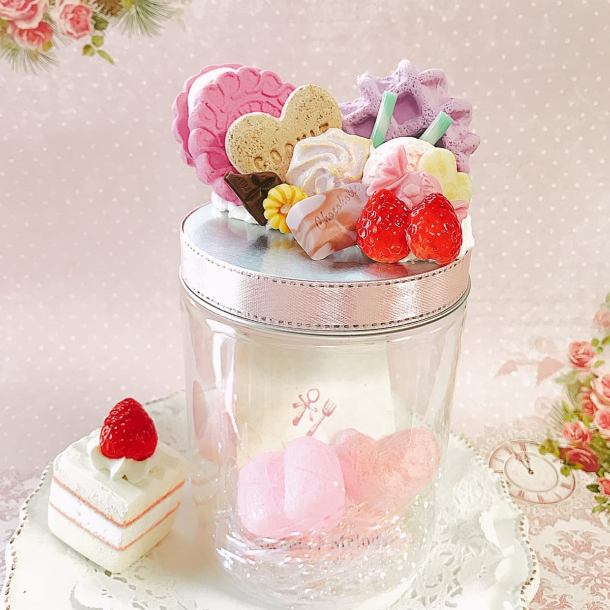スウィーツポットの蓋にクリームをしぼり、パーツをたくさんデコレーションする「スウィーツフォトポット」