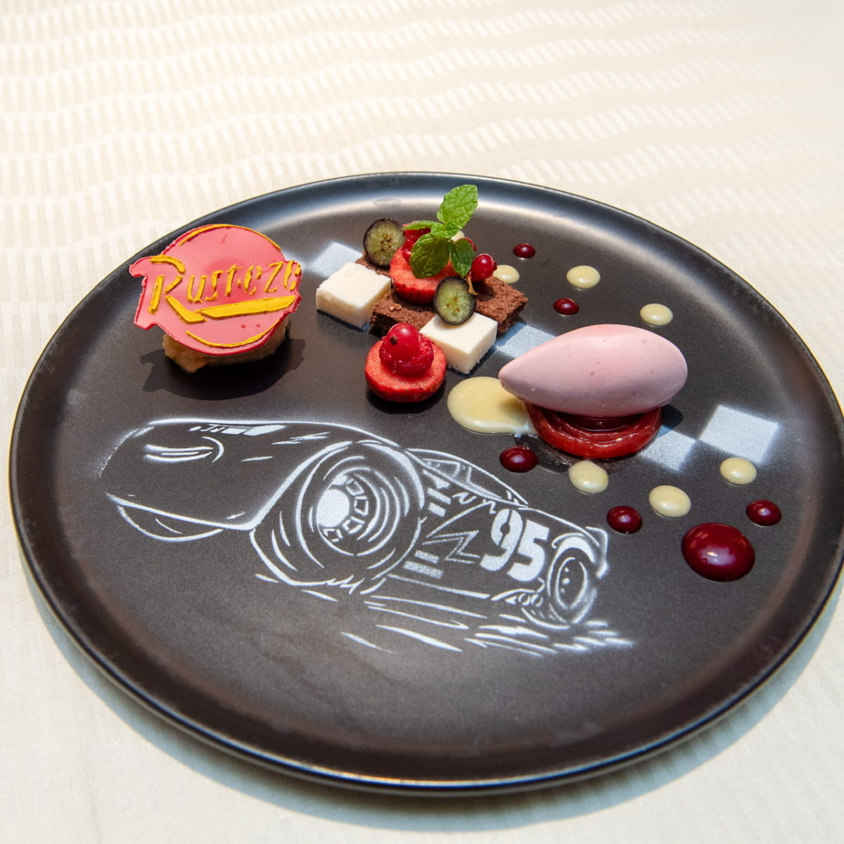 お皿に描かれた「ライトニング・マックィーン」が印象的なデザート。