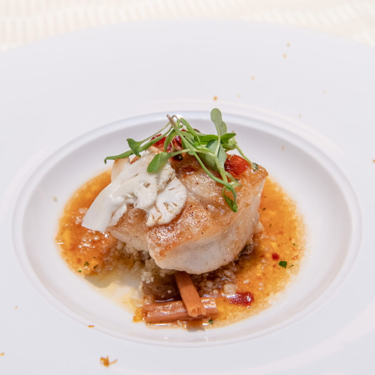 鰈のムニエル 柚子風味のグルノーブルソース カリフラワーとクスクスのサラダを添えて