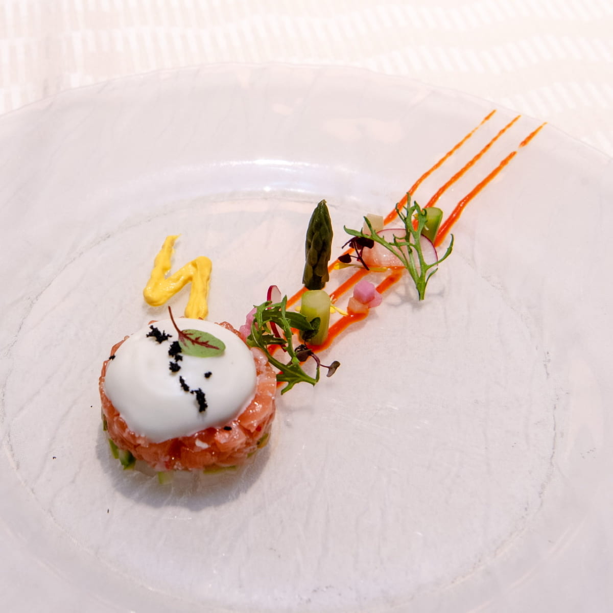 タルタルにはヨーグルトにわさびオイルをプラスしたムースがのっており、ほんのりピリッとした味わいがサーモンや紅ズワイガニとマッチしています。