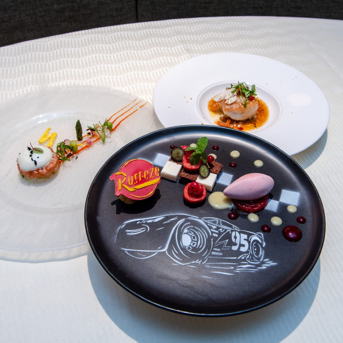「ライトニング・マックィーン」のイナズママークが印象的なサーモンと紅ズワイガニのタルタル。