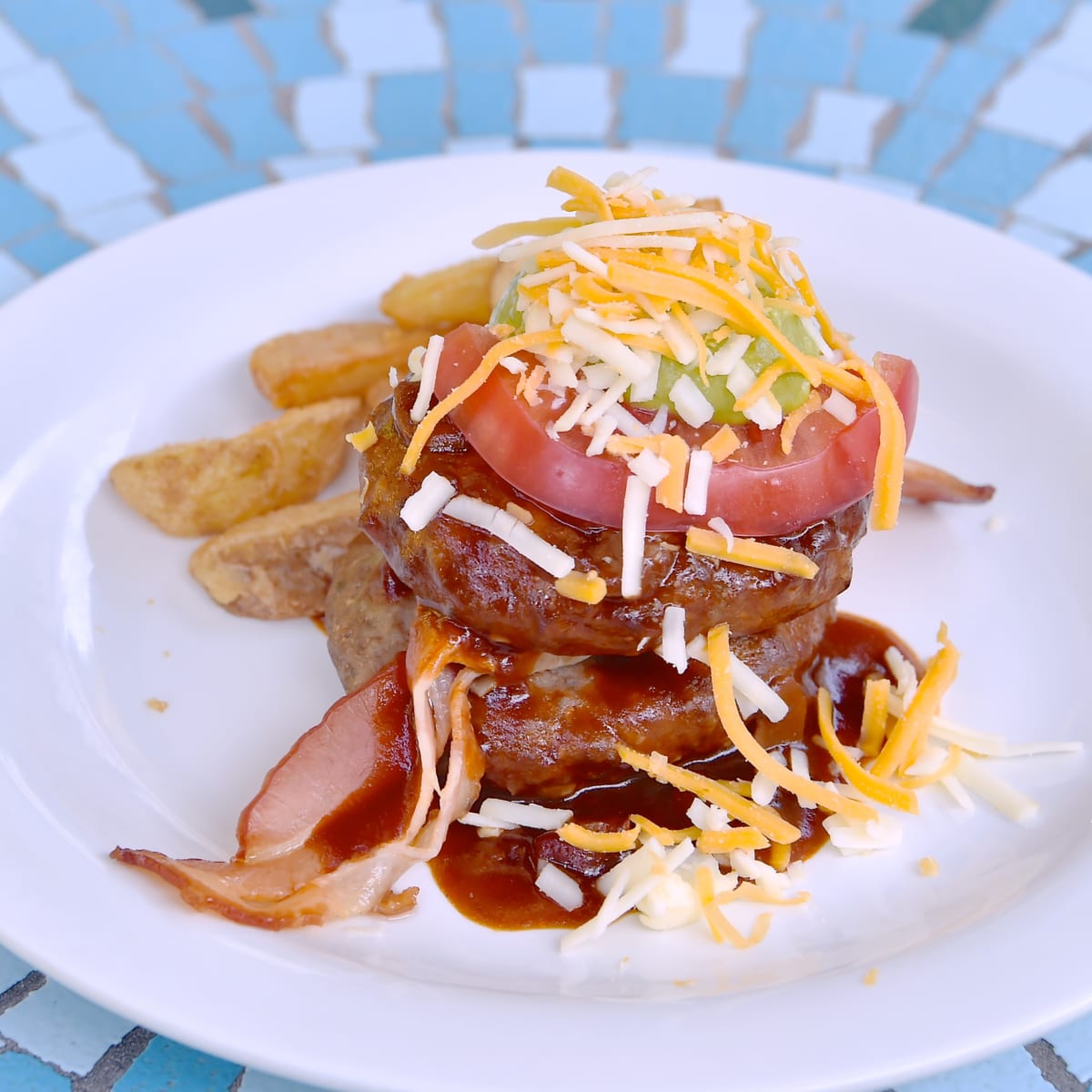 - ダブルハンバーグプレート(ベーコンチーズハンバーグ、フライドポテト)