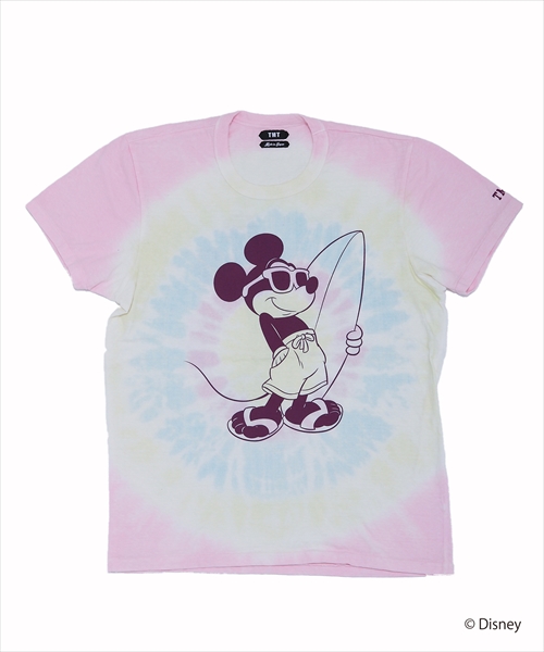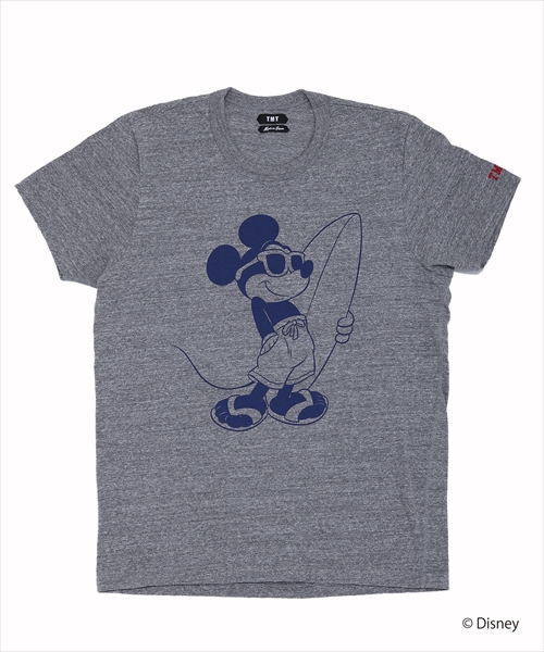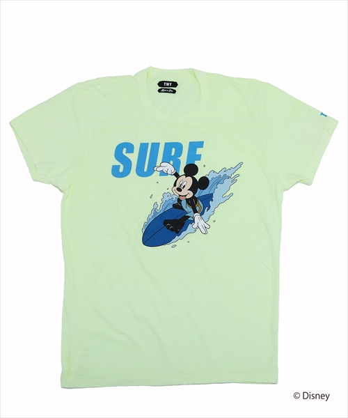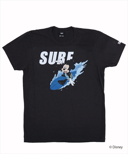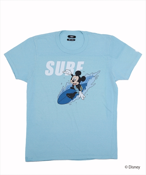 波乗りを楽しむ「ミッキーマウス」がデザインされたTシャツ。