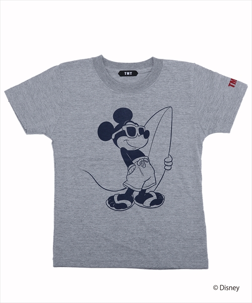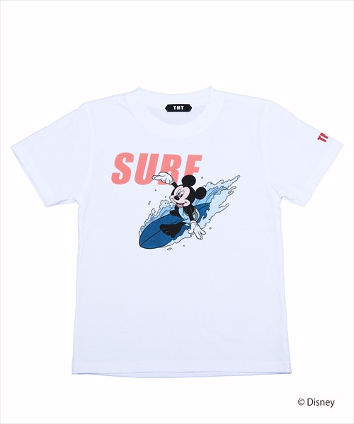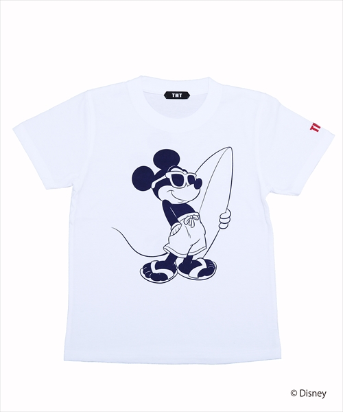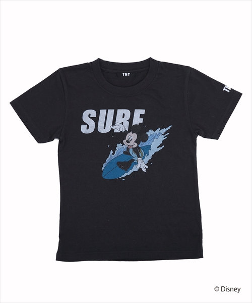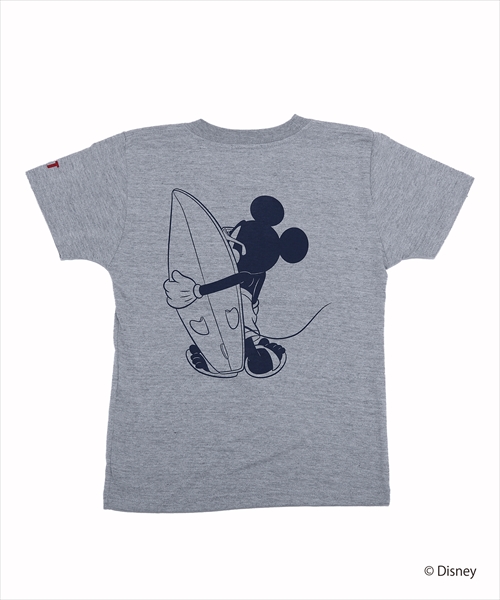 サーフボードを抱えた「ミッキーマウス」が前後にプリントされたキッズTシャツ。