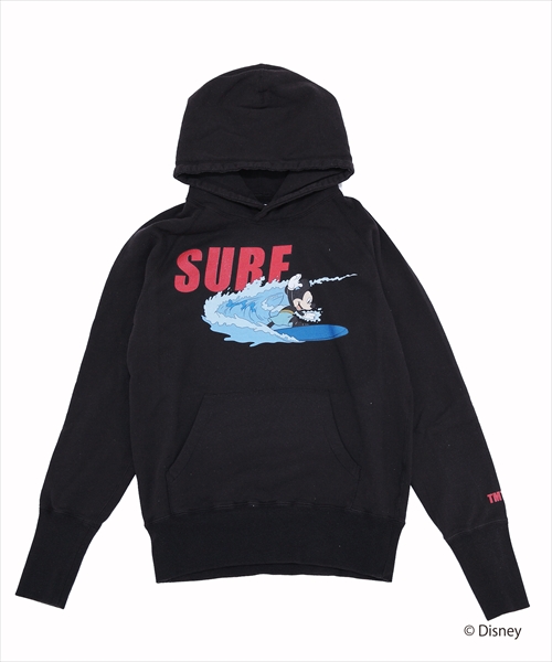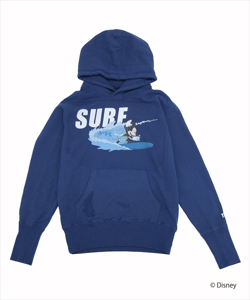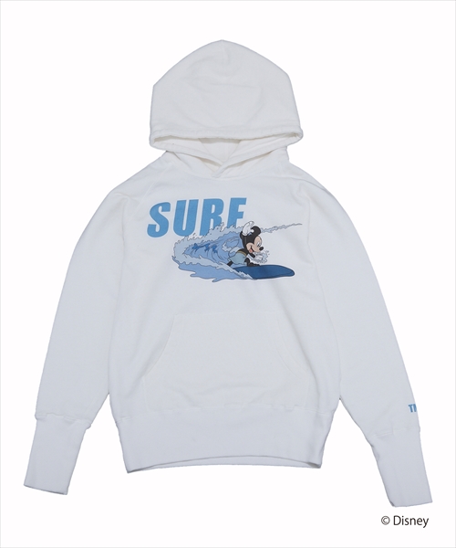 波乗りをイメージした「ミッキーマウス」とTMTオリジナルのSURFロゴが絶妙にマッチしたパーカー。