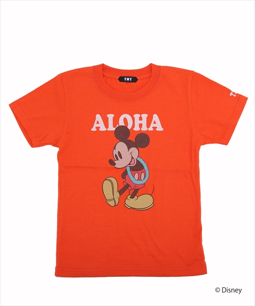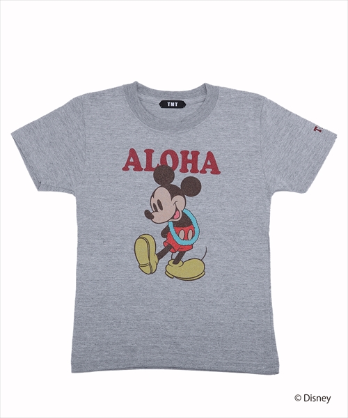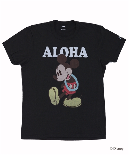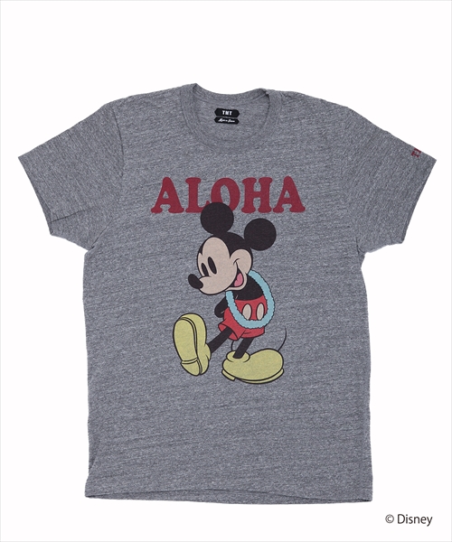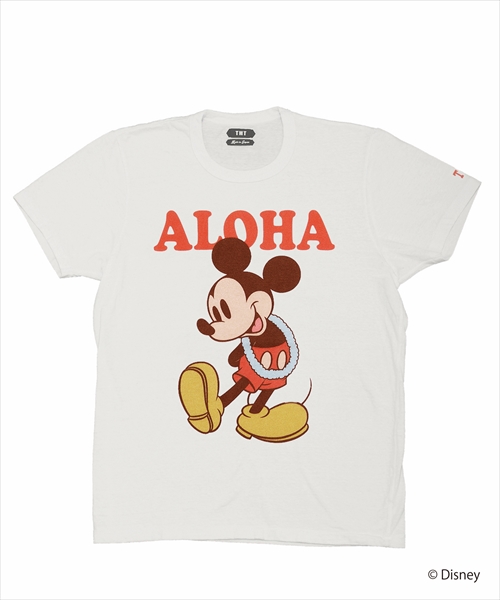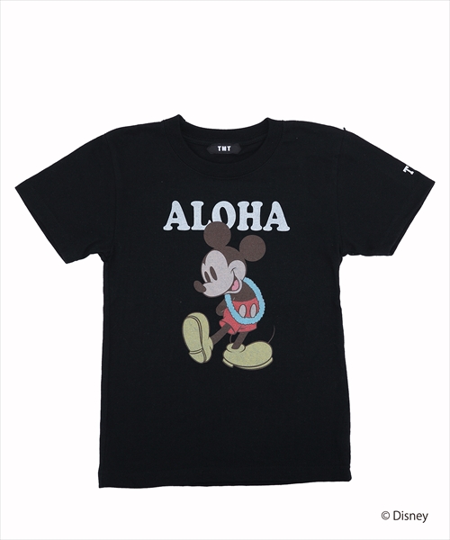 クラシックなボタンアイの「ミッキーマウス」とオリジナルのALOHAロゴが愛らしいTシャツ。