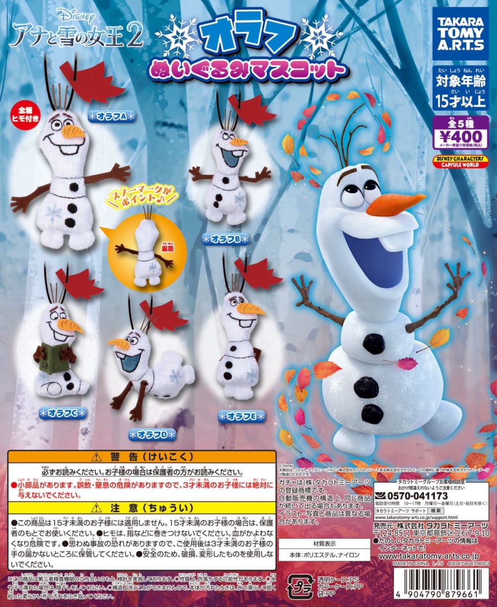 タカラトミーアーツのガチャから、『アナと雪の女王2』に登場する雪だるま「オラフ」のぬいぐるみマスコットが登場。