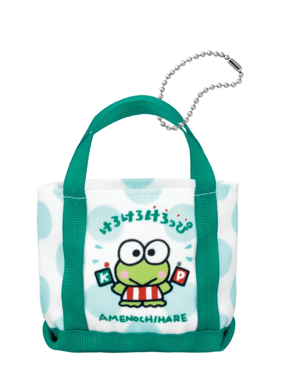両手にフラッグを持つ元気いっぱいの「けろけろけろっぴ」がデザインされた「ミニトートチャーム」。