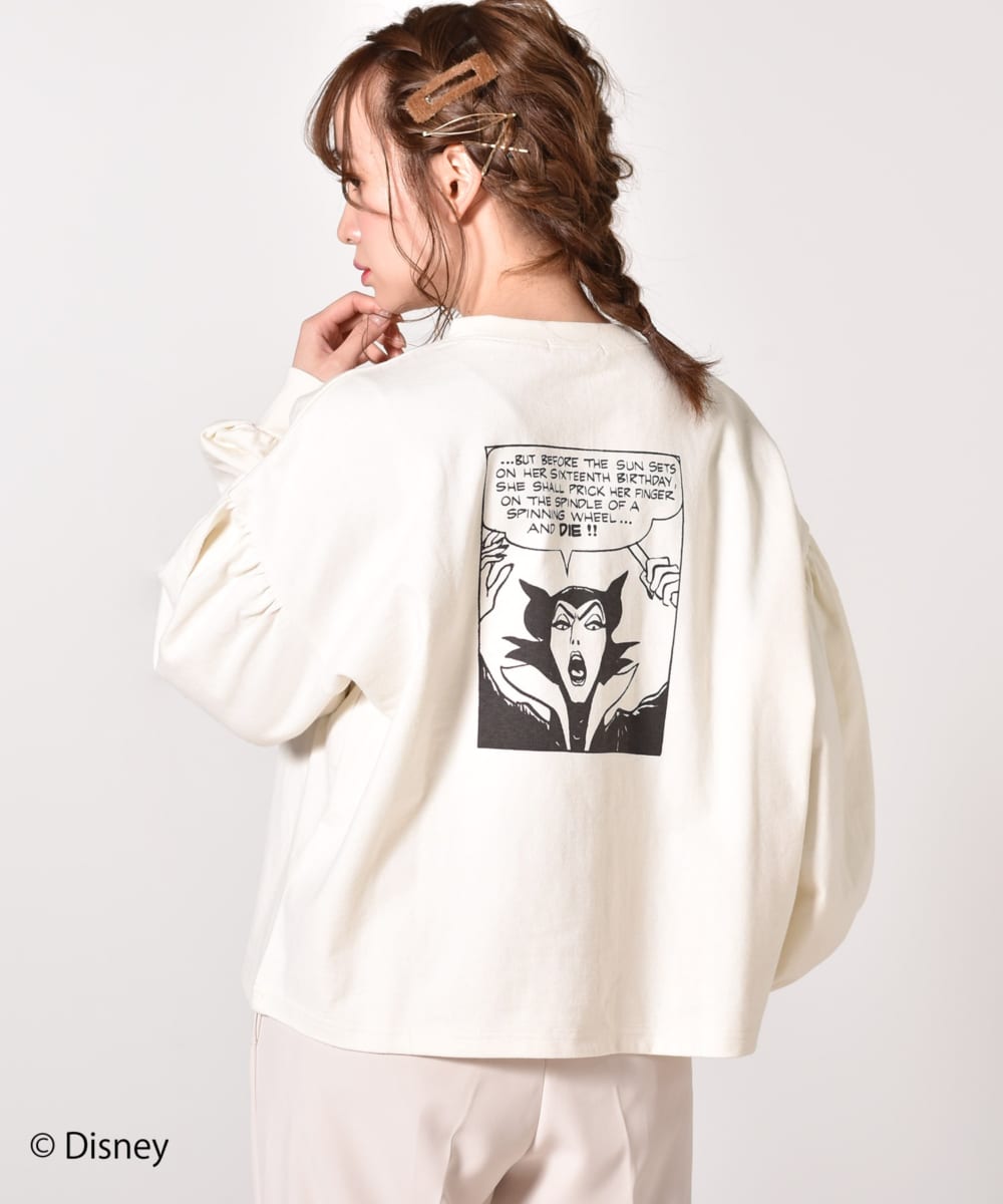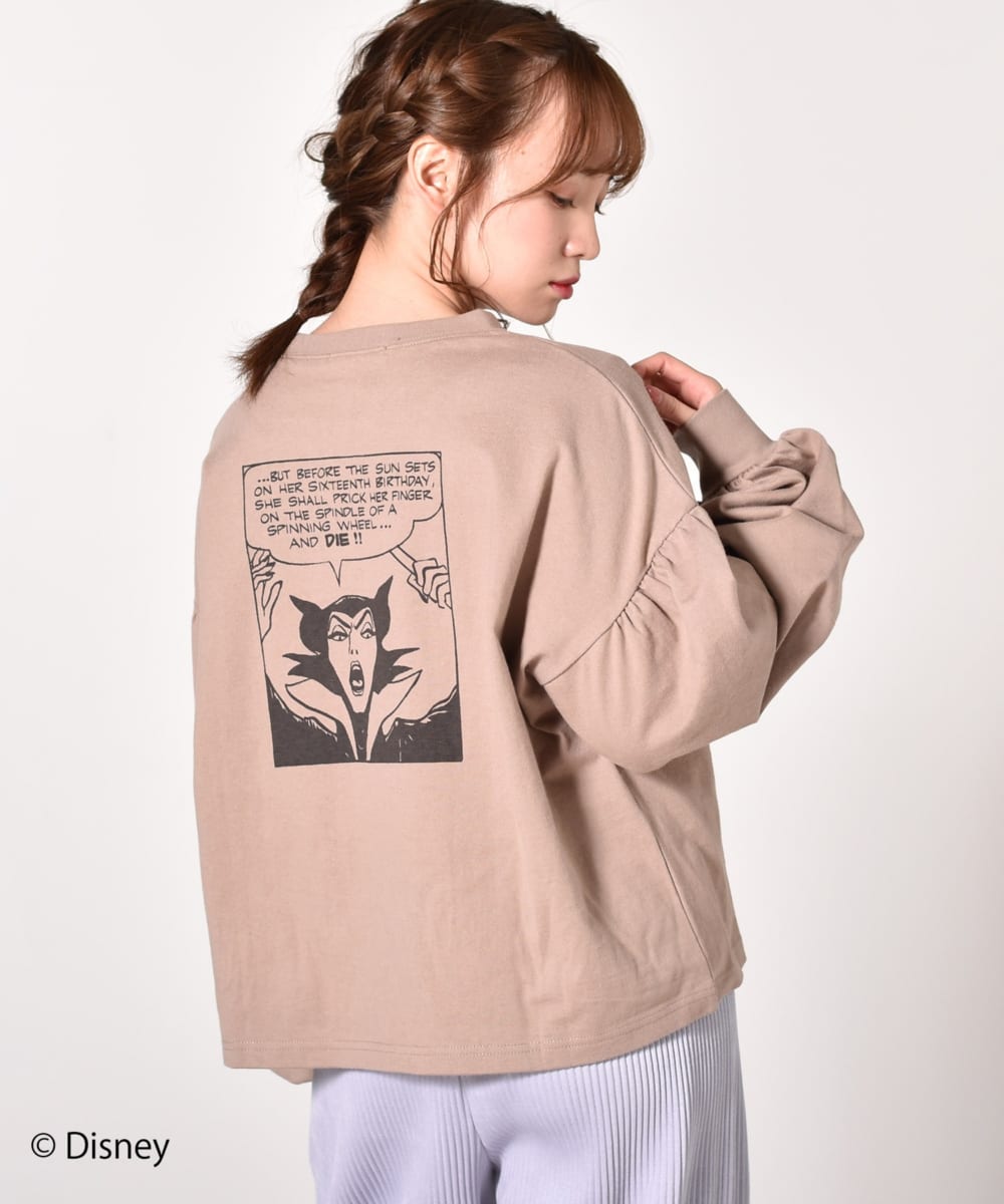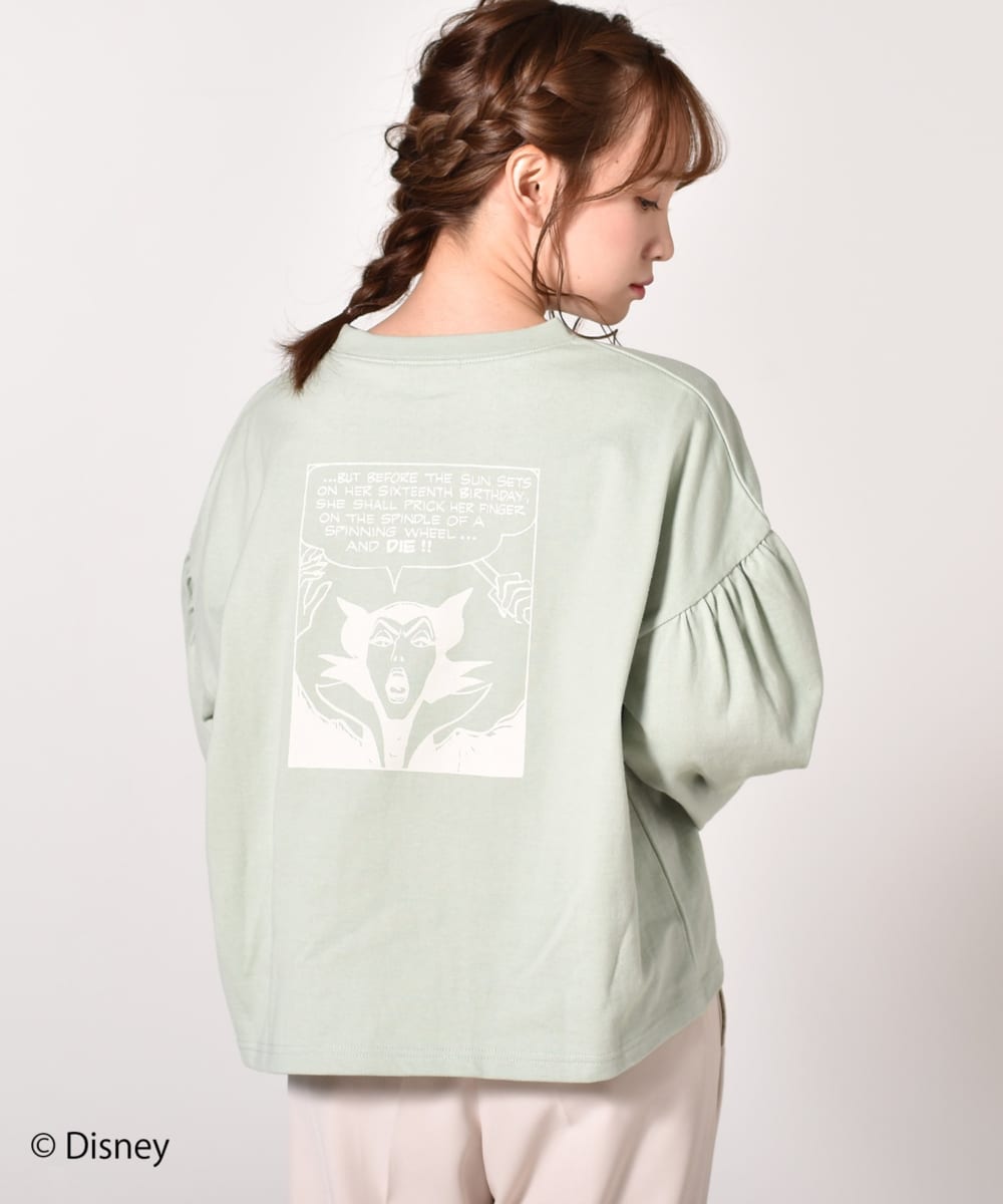 ディズニーアニメーション映画『眠れる森の美女』のディズニーヴィランズ「マレフィセント」のグラフィックをバックにプリントした長袖Tシャツ。