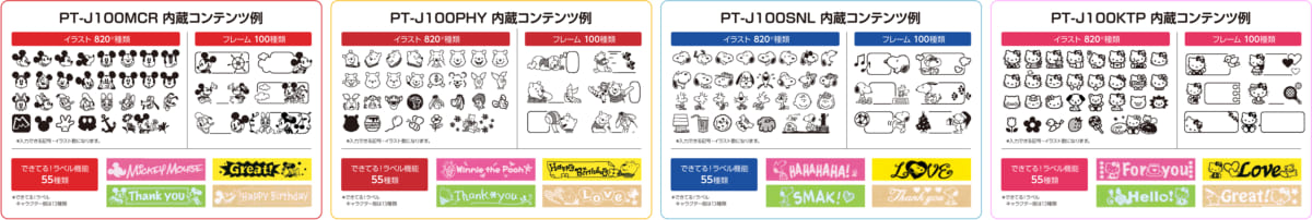 「PT-J100」シリーズは、本体にデザインされたキャラクターだけではなく、各キャラクターのイラストが入ったラベルを作成することが可能。