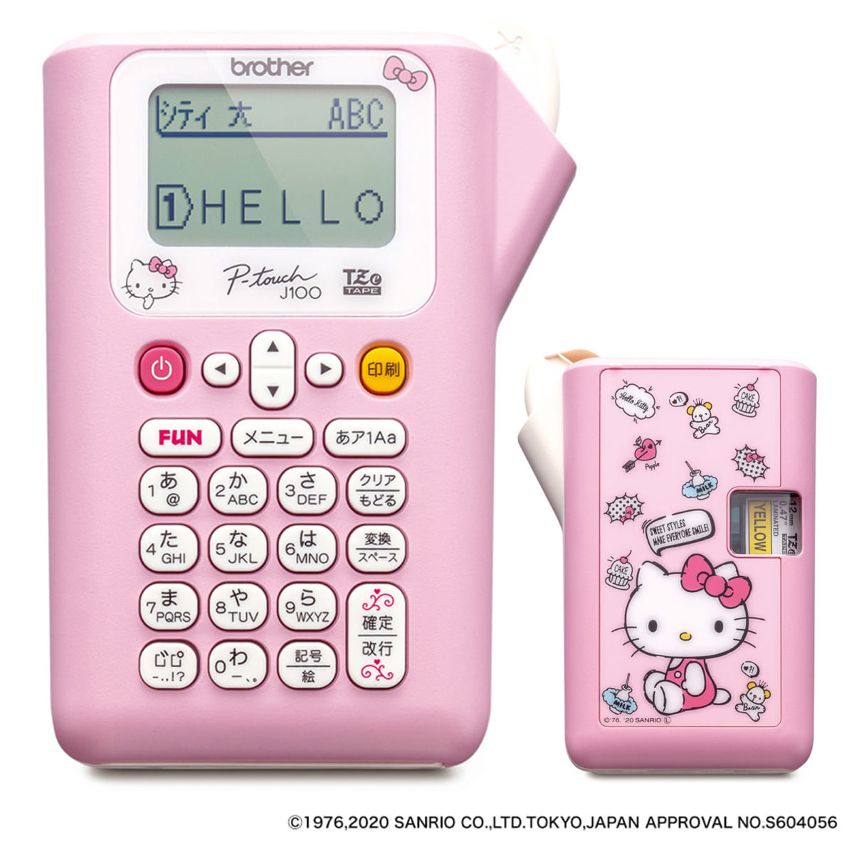 女の子らしいテイストでデザインされた「ハローキティ」デザインの「PT-J100」