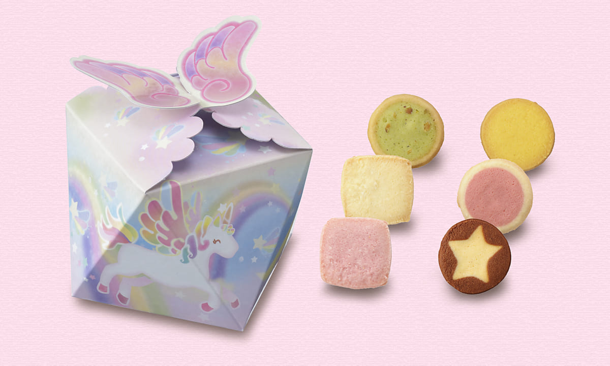 ユニコーンが描かれた“ゆめかわボックス”の天使の羽のフタを開けると、6種類のさくさくクッキーが入っています。