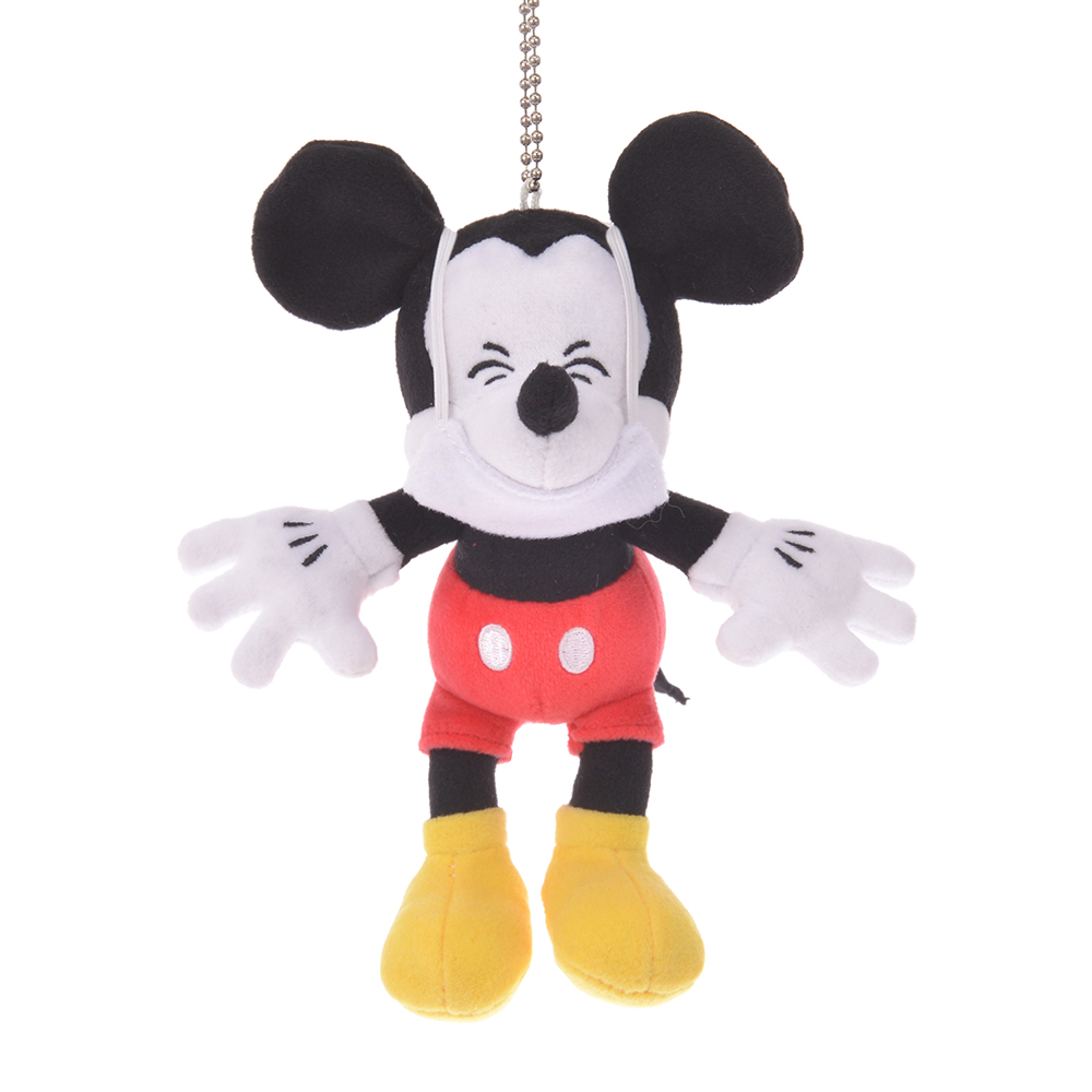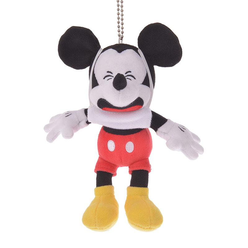 マスクをしているミッキーマウスのぬいぐるみバッジ。