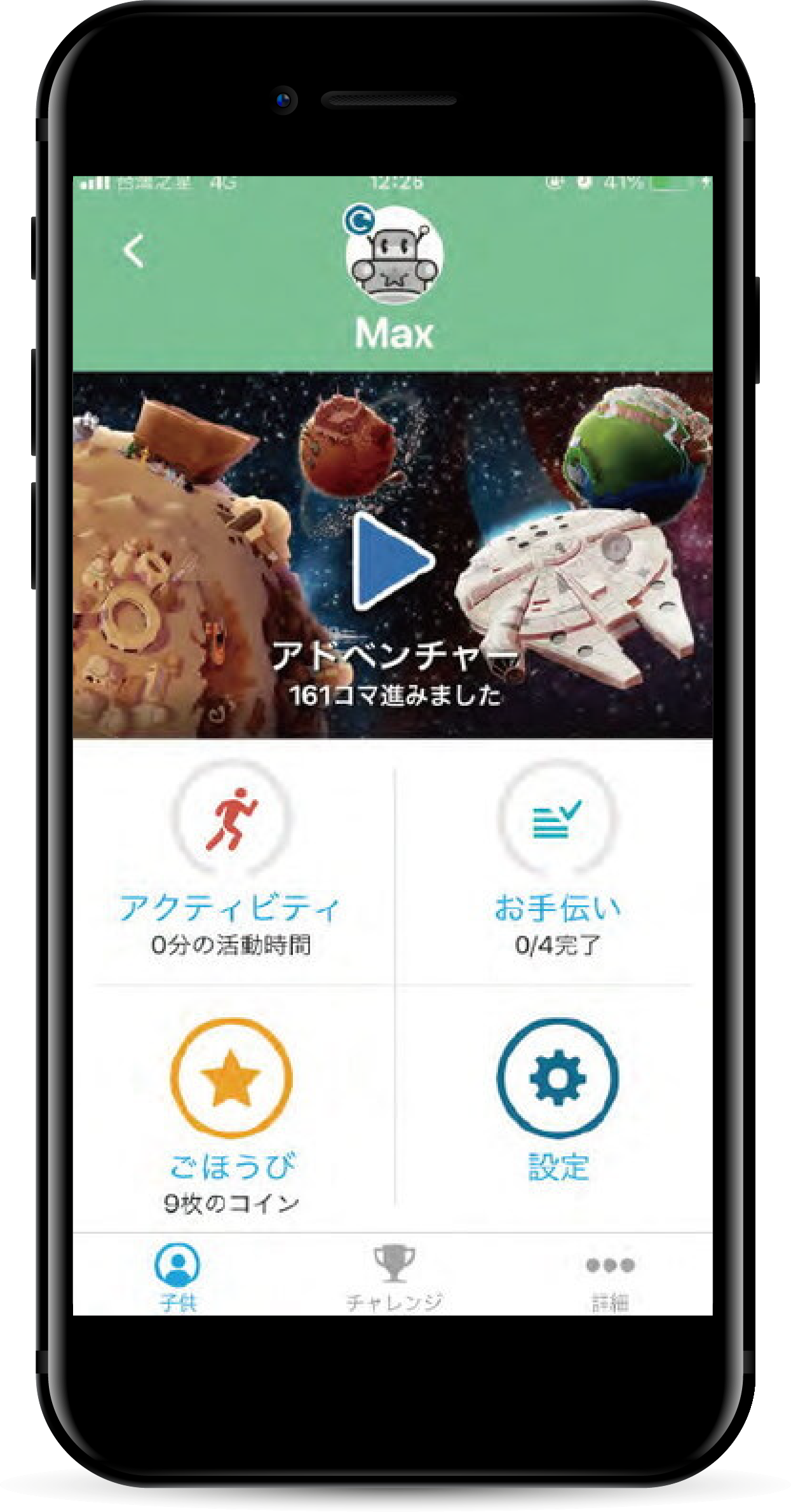 お手伝いを行うごとにアプリ内で仮想コインを集めることができ、コインをたくさん集めてご褒美と交換するなど、お子様と保護者の方が一緒に楽しめる機能になっています。