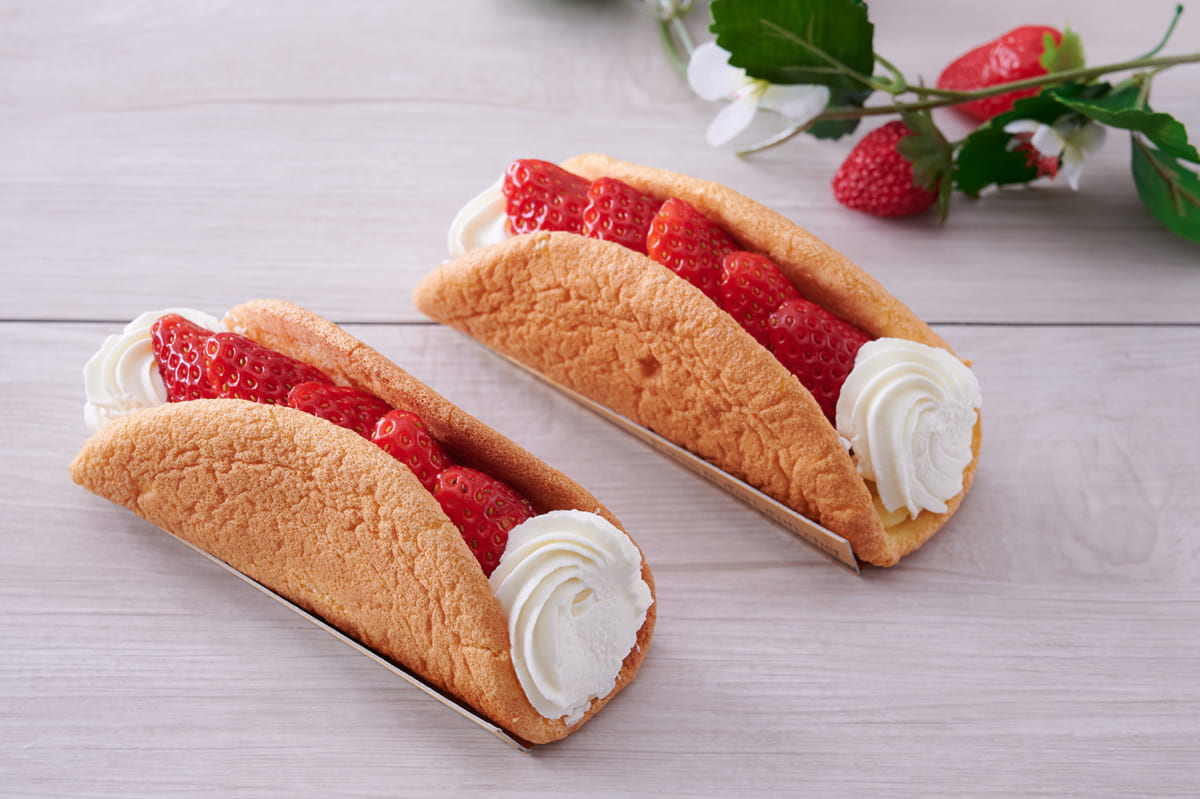 ふんわりと焼き上げたアーモンド風味のビスキーで、苺とバナナのコンフィチュール、生クリーム、カスタードクリームを包んだ苺のオムレット。
