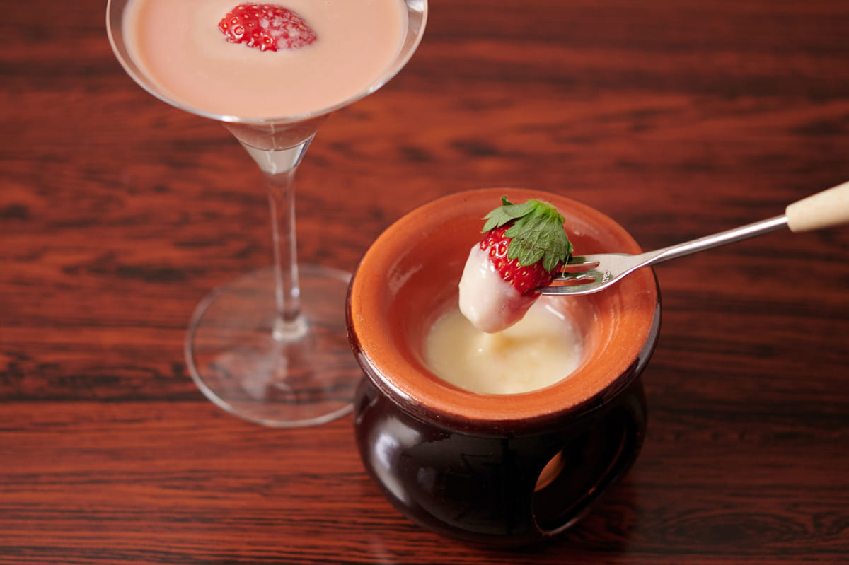 グラスの縁に飾った苺をホワイトチョコにディップし、濃厚なカクテルと一緒に楽しみます。