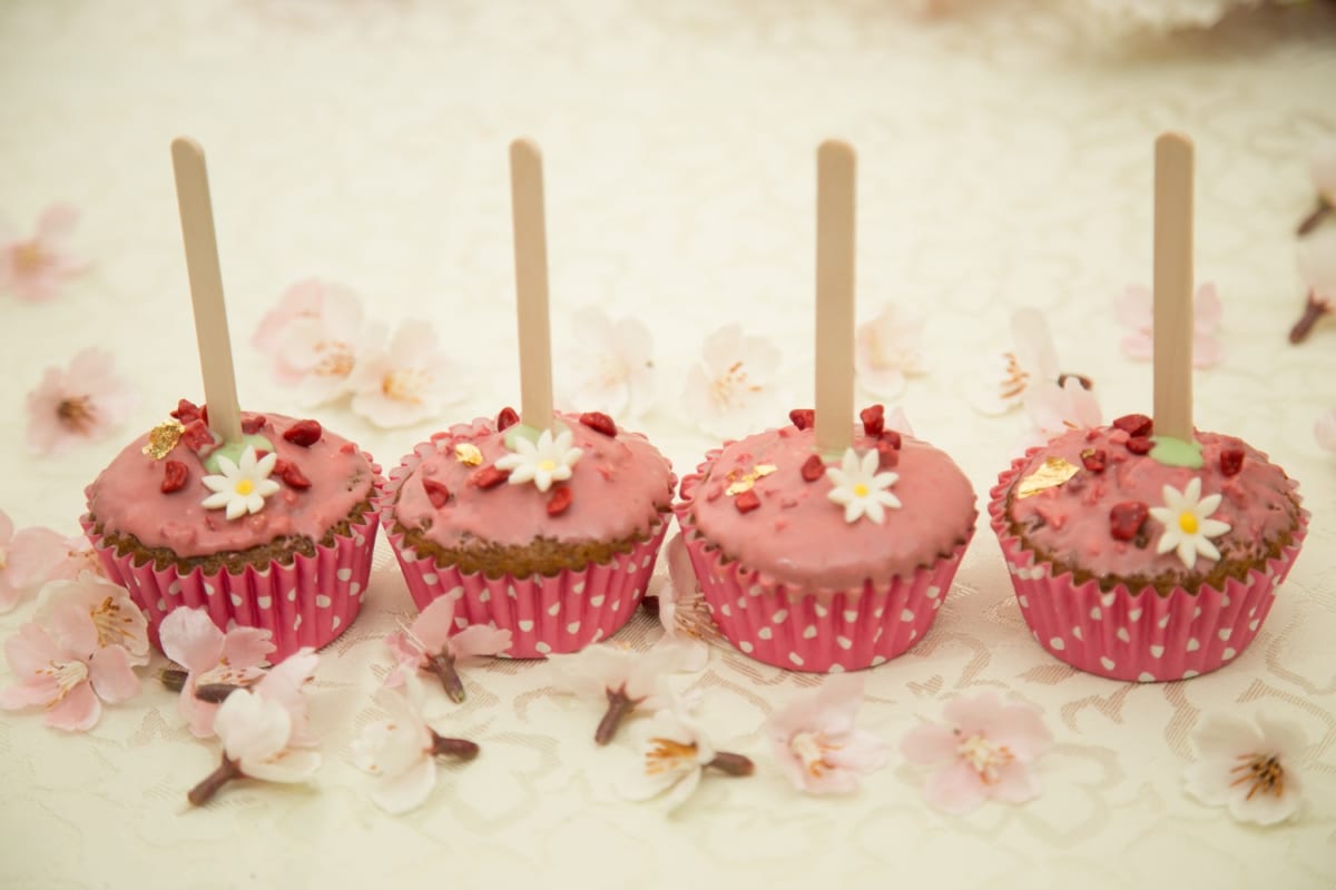 苺のチョコレートでコーティングしたバナナブレッドをロリポップ風にアレンジしたスイーツ。