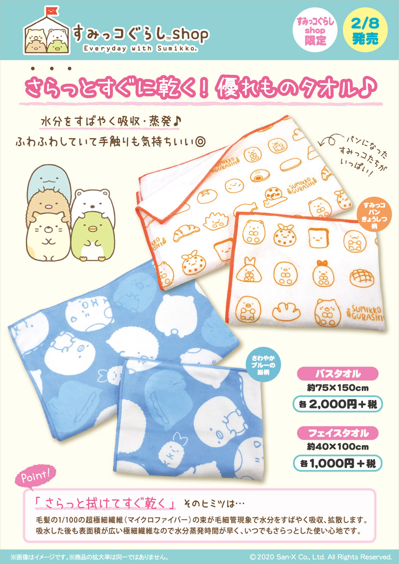 すみっコぐらしの吸水速乾タオル(フェイスタオル・バスタオル)が、すみっコぐらしshop限定で2020年2月8日(土)から販売開始されます。