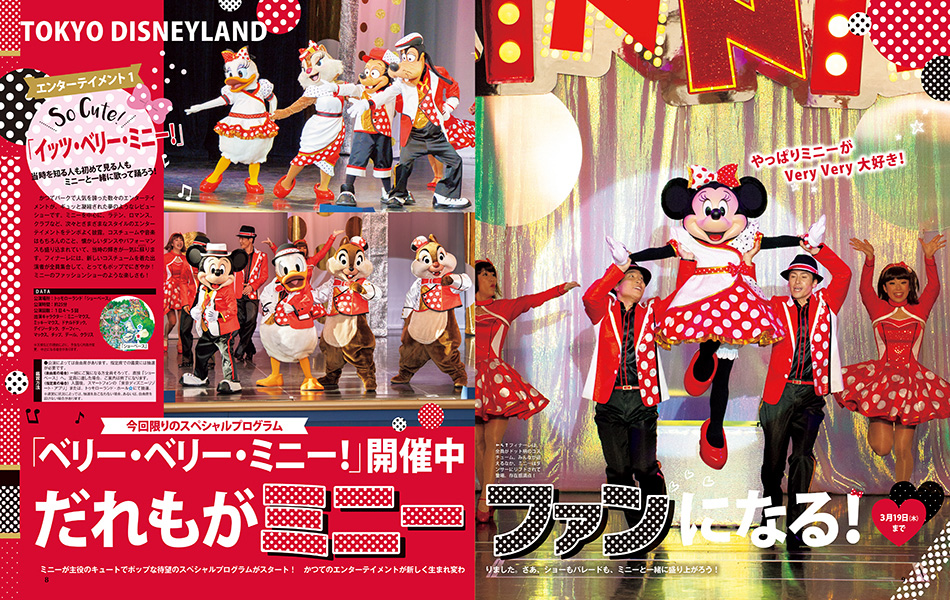 東京ディズニーランド特集では、[今回限りのスペシャルプログラム「ベリー・ベリー・ミニー!」開催中だれもがミニーファンになる!]や、