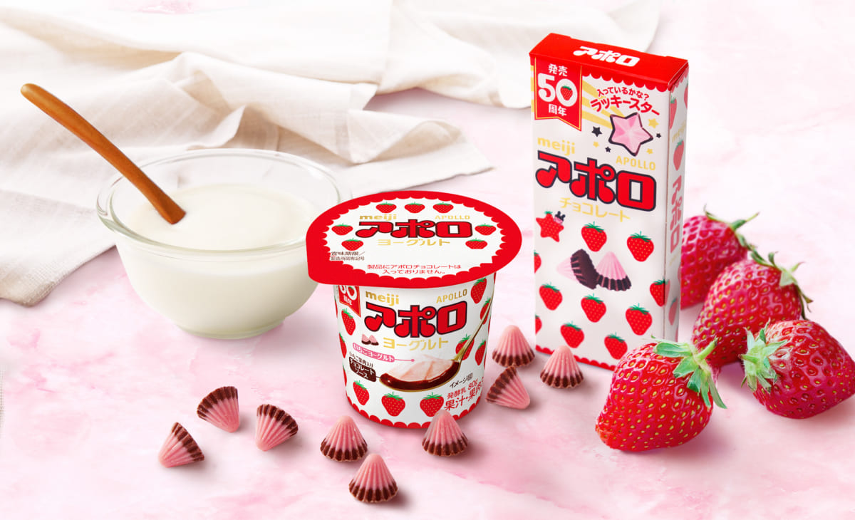 「アポロヨーグルト」は、濃厚なのに後味すっきりのいちごヨーグルト(上層)と、いちご果肉が入ったチョコレートソース(下層)を明治の独自技術を用いて2層仕立てにし「アポロ」チョコレートの構造と味わいが表現されています。