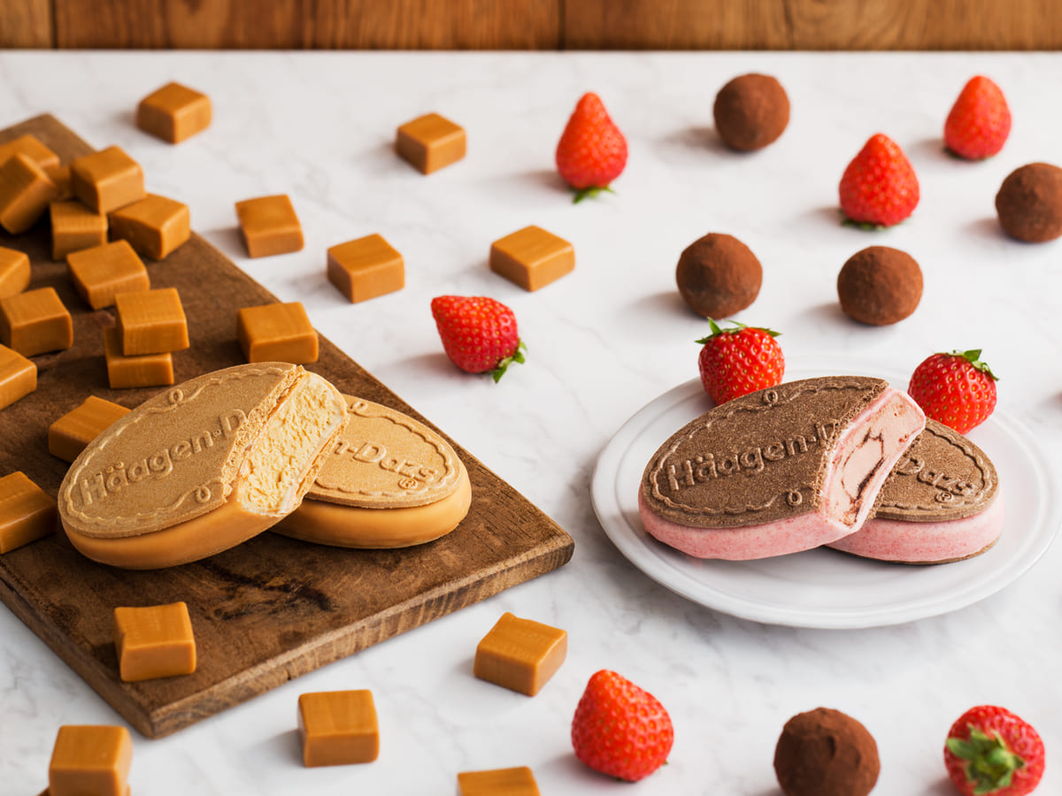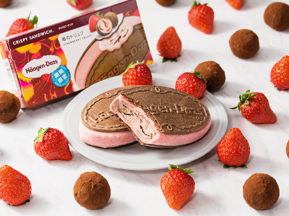 ハーゲンダッツのクリスピーサンドシリーズに、通年フレーバー「ザ・キャラメル」と期間限定「苺のトリュフ」が登場。