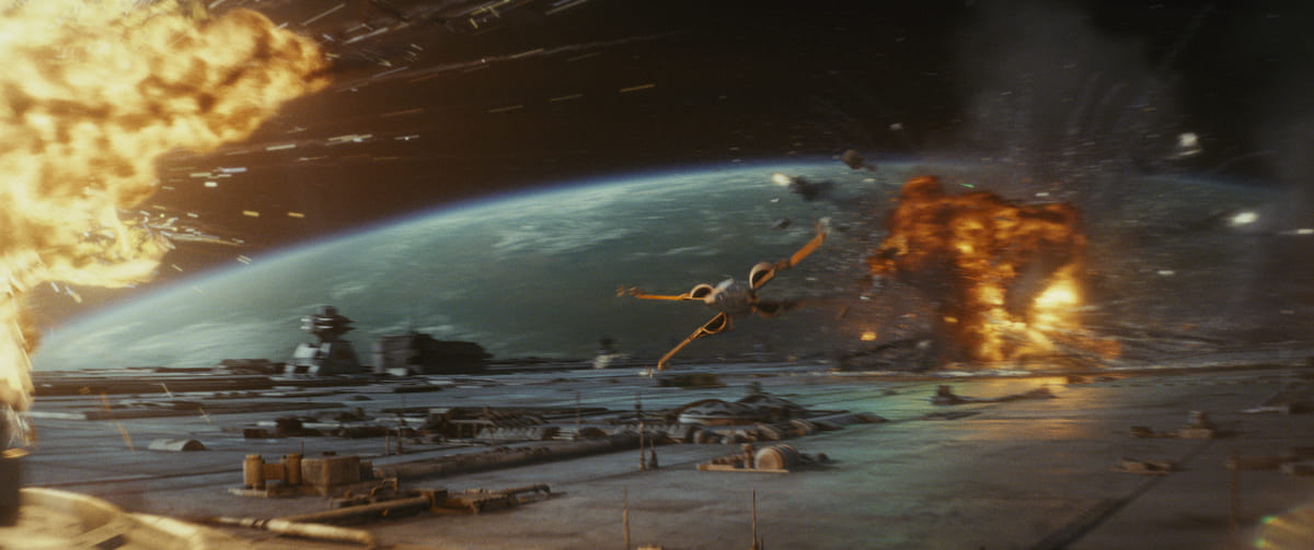 爆撃部隊は一機、また一機と撃ち落とされますが、最後の一機の操縦士による身を呈した攻撃がファースト・オーダーの巨大艦艇を爆破するのでした。