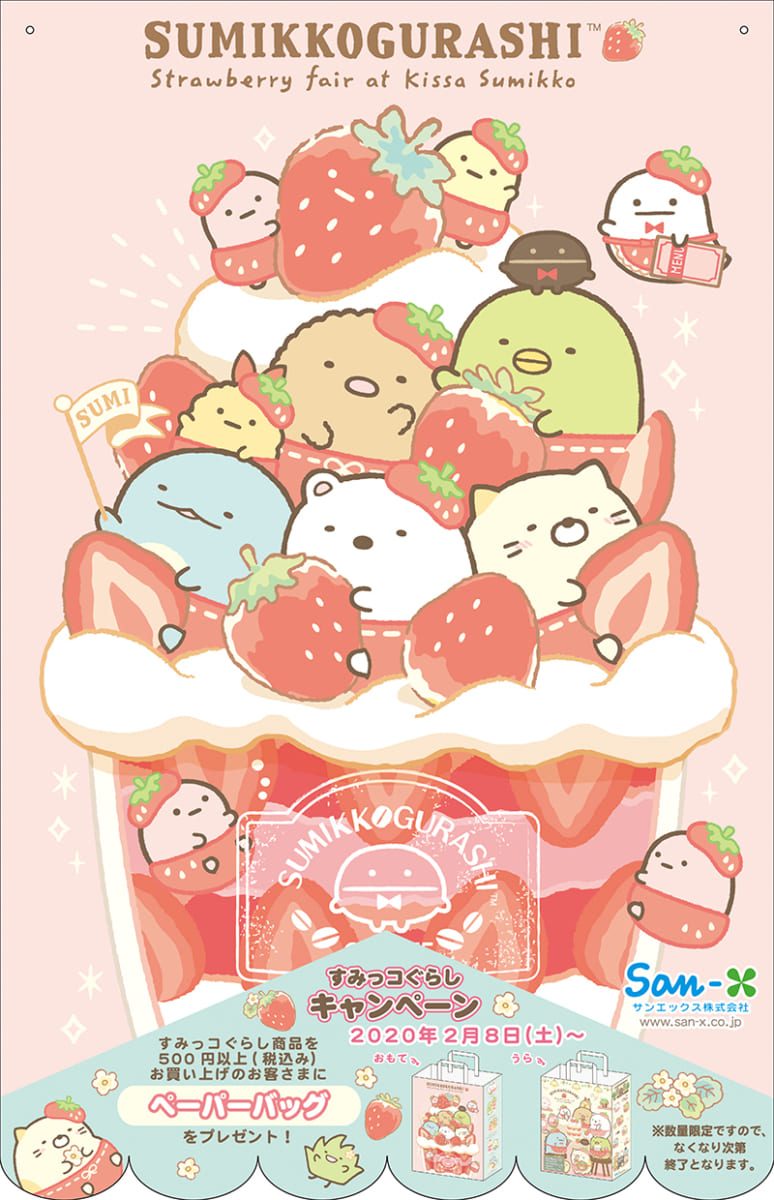 すみっコぐらし「喫茶すみっコでいちごフェア」テーマの新商品の発売を記念して、対象店舗にて2020年2月8日(土)から店頭キャンペーンがスタートします。