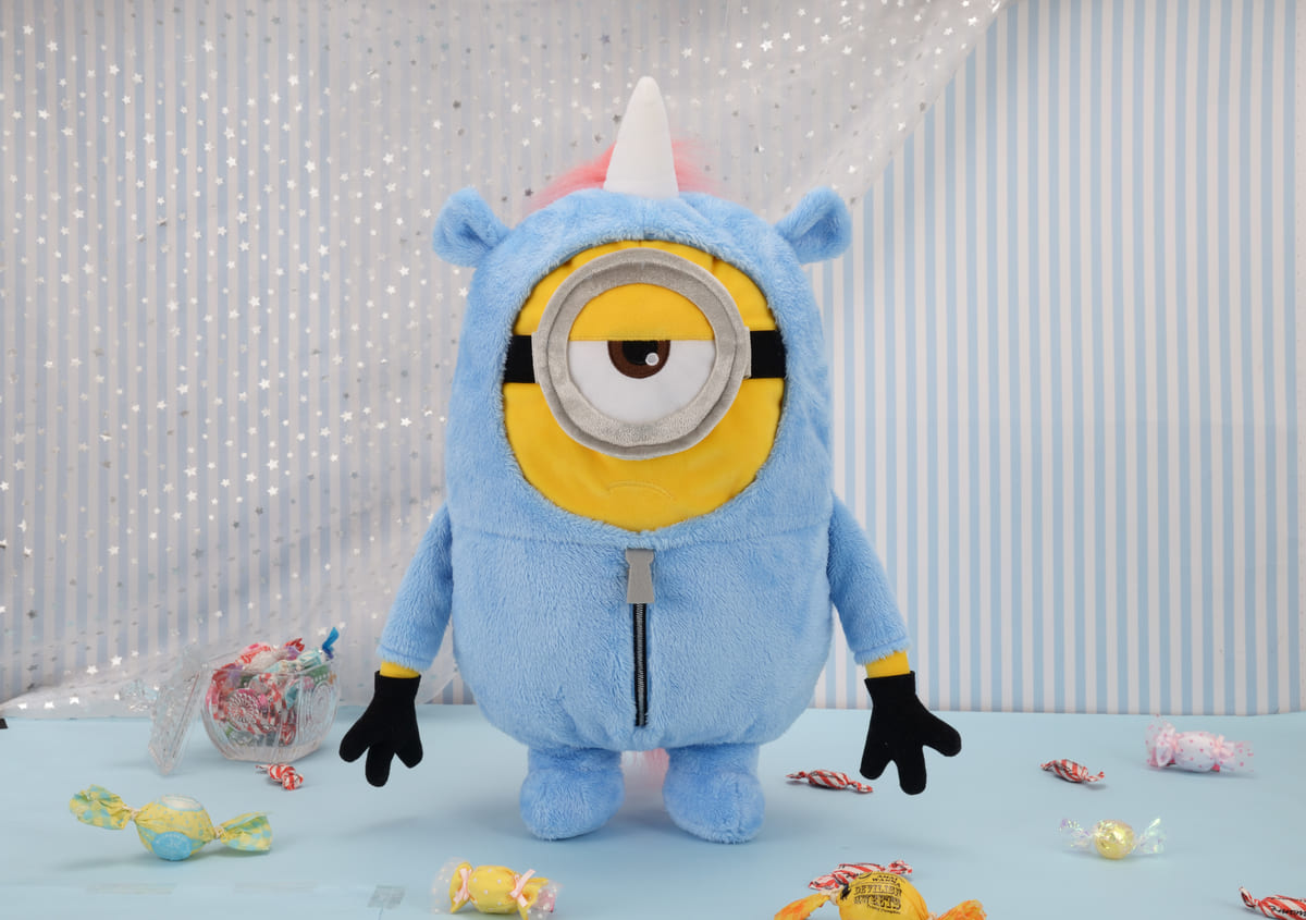 「ミニオン」が「フラッフィ」の着ぐるみを着た姿のメガジャンボぬいぐるみ。