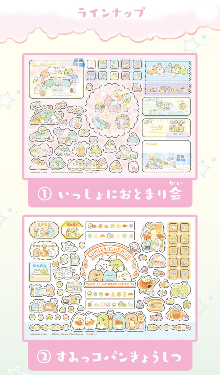 人気のテーマ「いっしょにおとまり会」と「すみっコパンきょうしつ」デザイン。