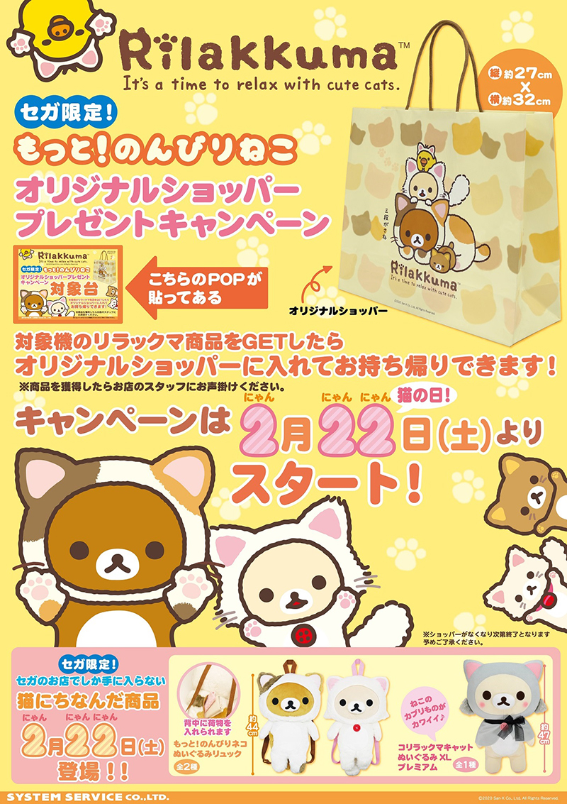 2020年2月は、リラックマのキュートなぬいぐるみや、実用的なサラダボウルセット、収納ボックス、バングルウォッチなどのグッズが登場するほか、セガ限定でプレゼントキャンペーンも開催されます☆