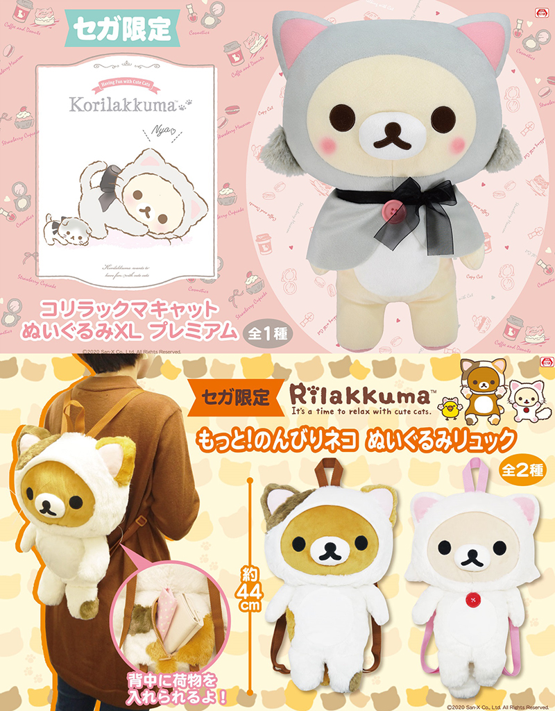セガ限定「リラックマ コリラックマキャット ぬいぐるみXL プレミアム/リラックマ もっと!のんびりネコ ぬいぐるみリュック」