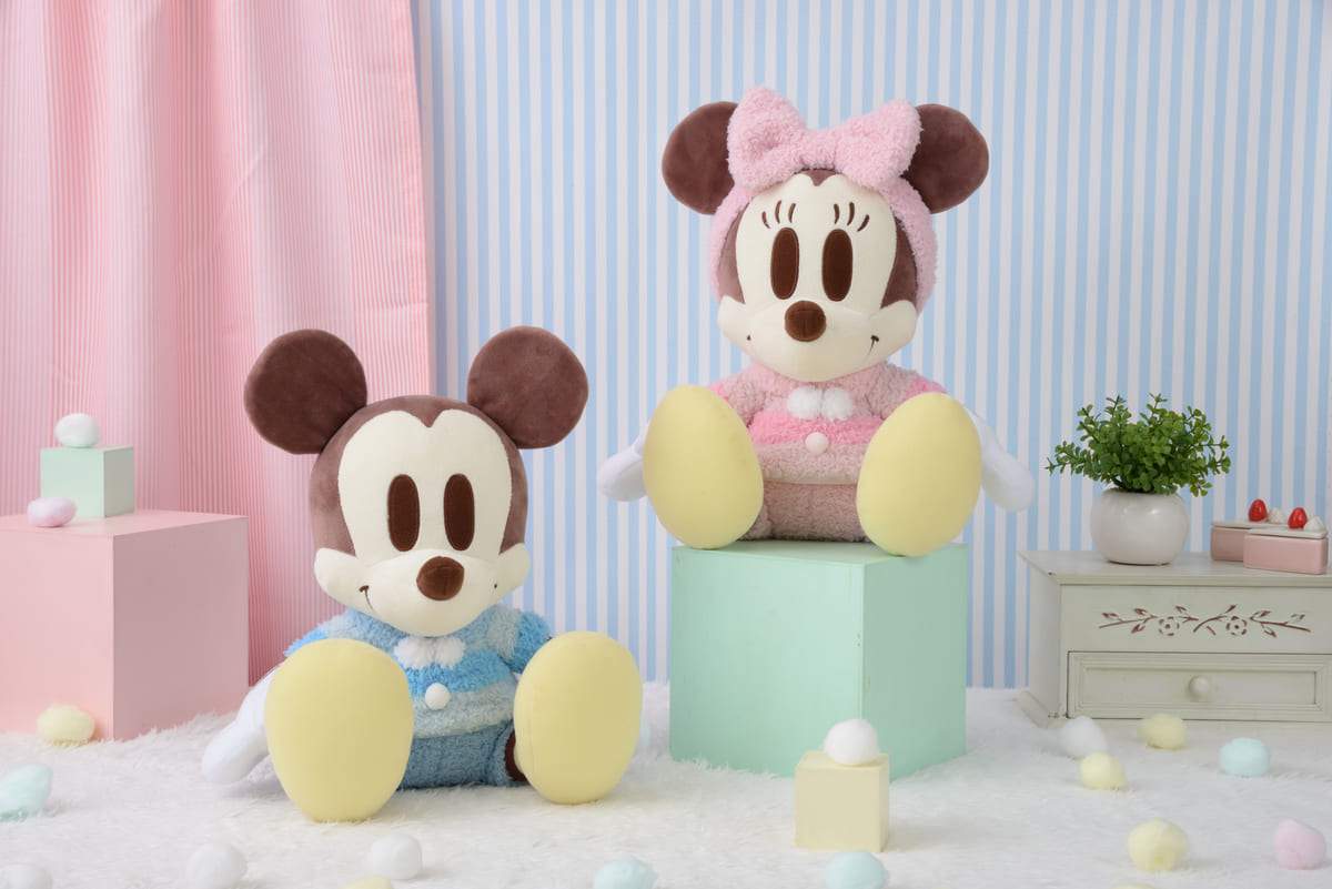 もこもことしたリラックスウェアを着た「ミッキーマウス」と「ミニーマウス」のぬいぐるみ。