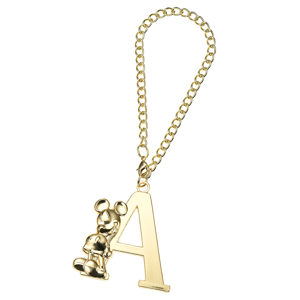 アルファベットにミッキーが寄り添う、ゴールドカラーのバッグチャーム。