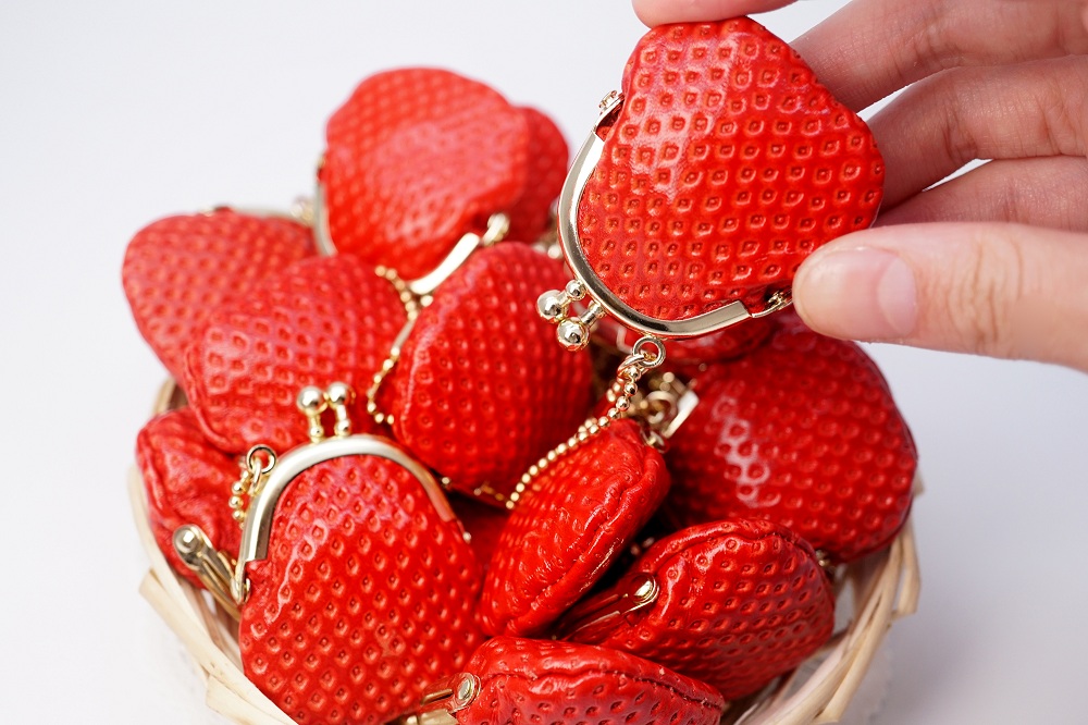 国産牛革を特殊加工し、いちごの色味や凹凸が再現されています。
