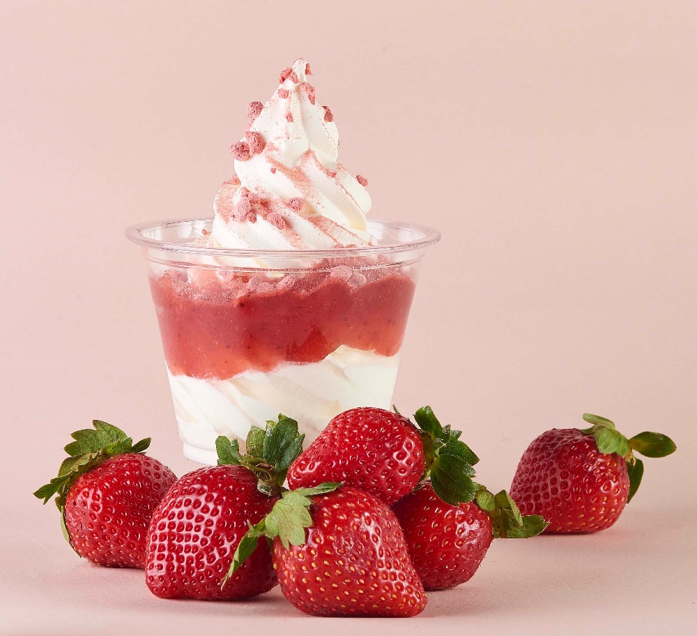 まるで生クリームを凍らせたようなソフトクリームに、福岡県産「あまおう苺」」のソースとフリーズドライ、パウダーが贅沢にトッピングされています☆