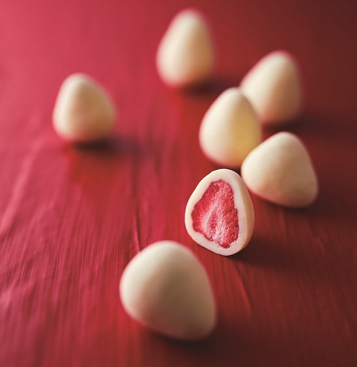 フリーズドライされた甘酸っぱい苺が、ミルク風味のクリーミーなホワイトチョコでコーティングされています。