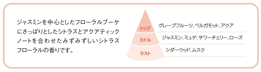 最近のトレンドであるナチュラル感やみずみずしさを感じられる、さっぱりとしたシトラスフローラルの香りです。