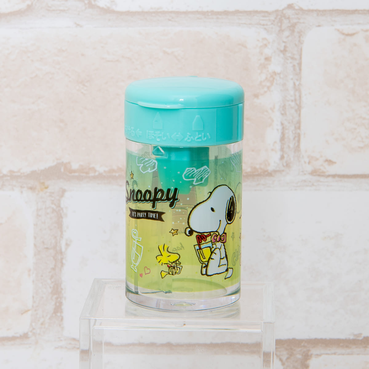 向かい合わせにドリンクを飲む「スヌーピー」と「ウッドストック」が描かれた「円筒シャープナー」