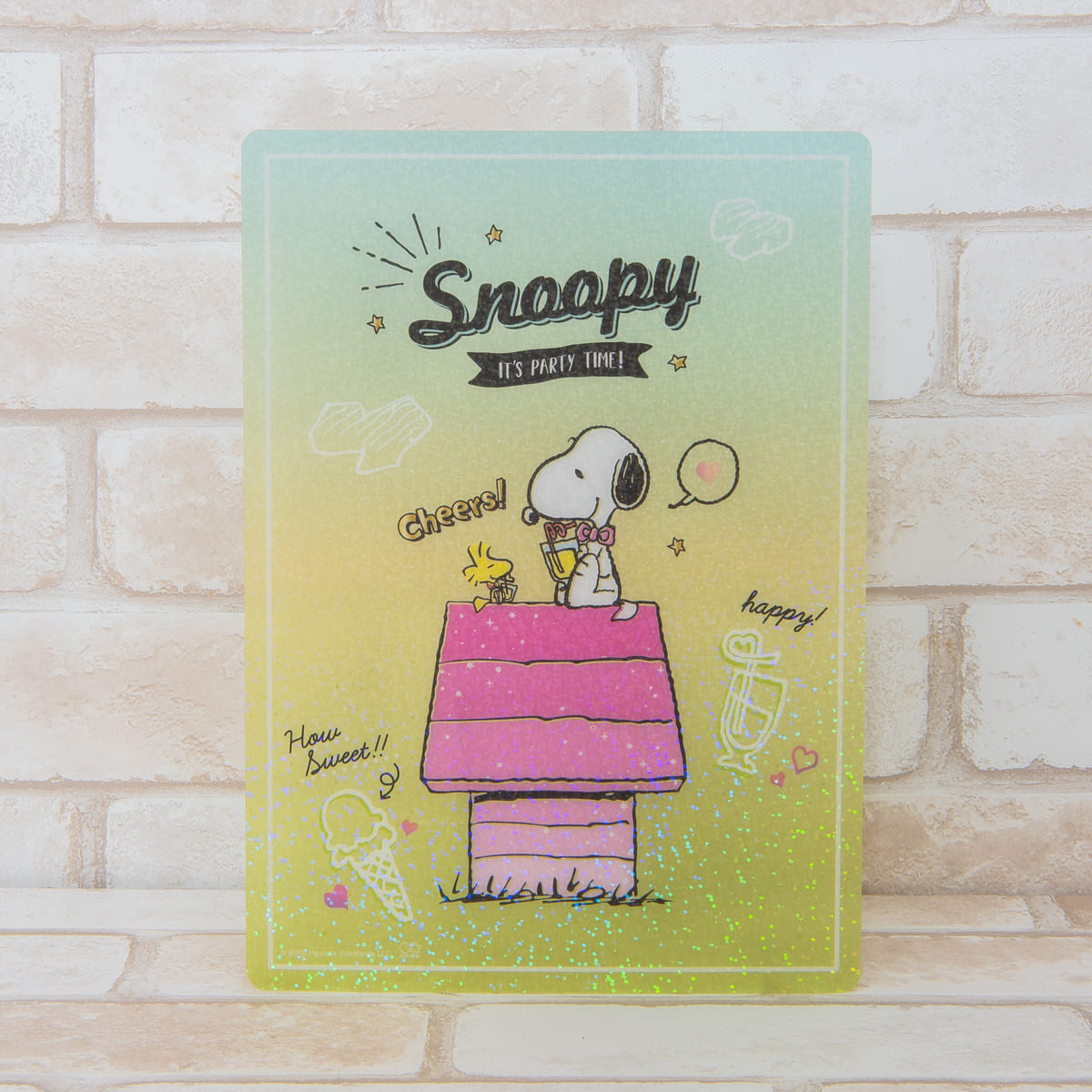 キラキラのホログラム加工が施された本体に「スヌーピー」と「ウッドストック」のアートが描かれた、クリアタイプの「下敷」