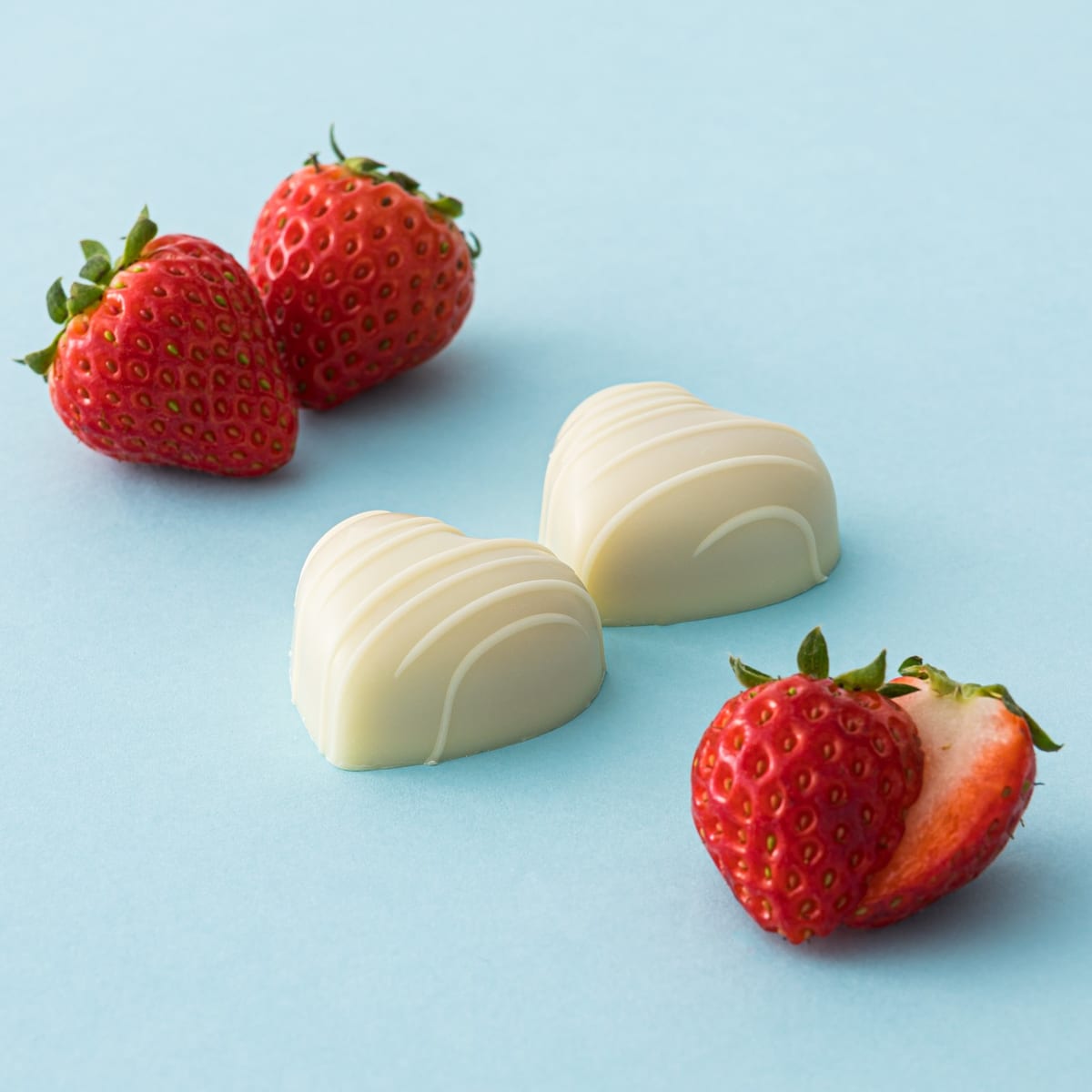 ホワイトデーの期間限定プラリネのひとつホワイト ストロベリーハートは、かわいいハート型のプラリネ。