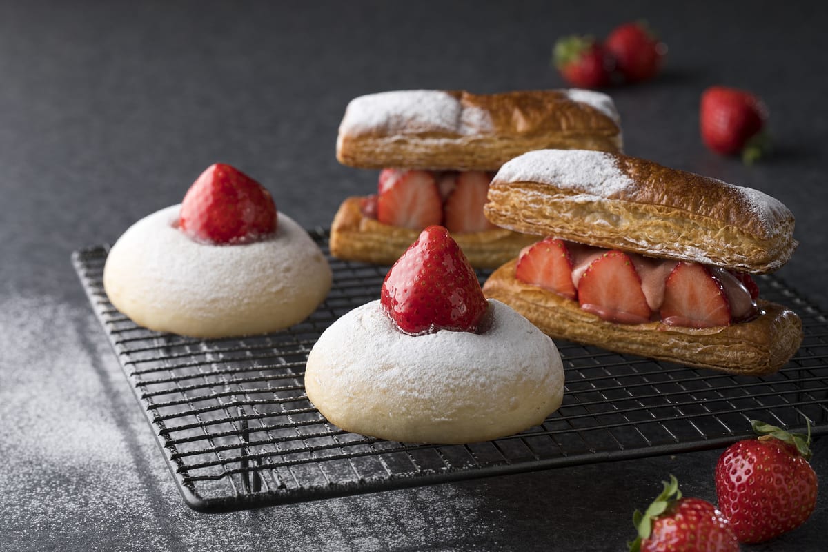 クロワッサンに、苺のカスタードクリームを絞って焼き上げ、苺のクリームと苺をたっぷりとサンドした「苺のデニッシュ」