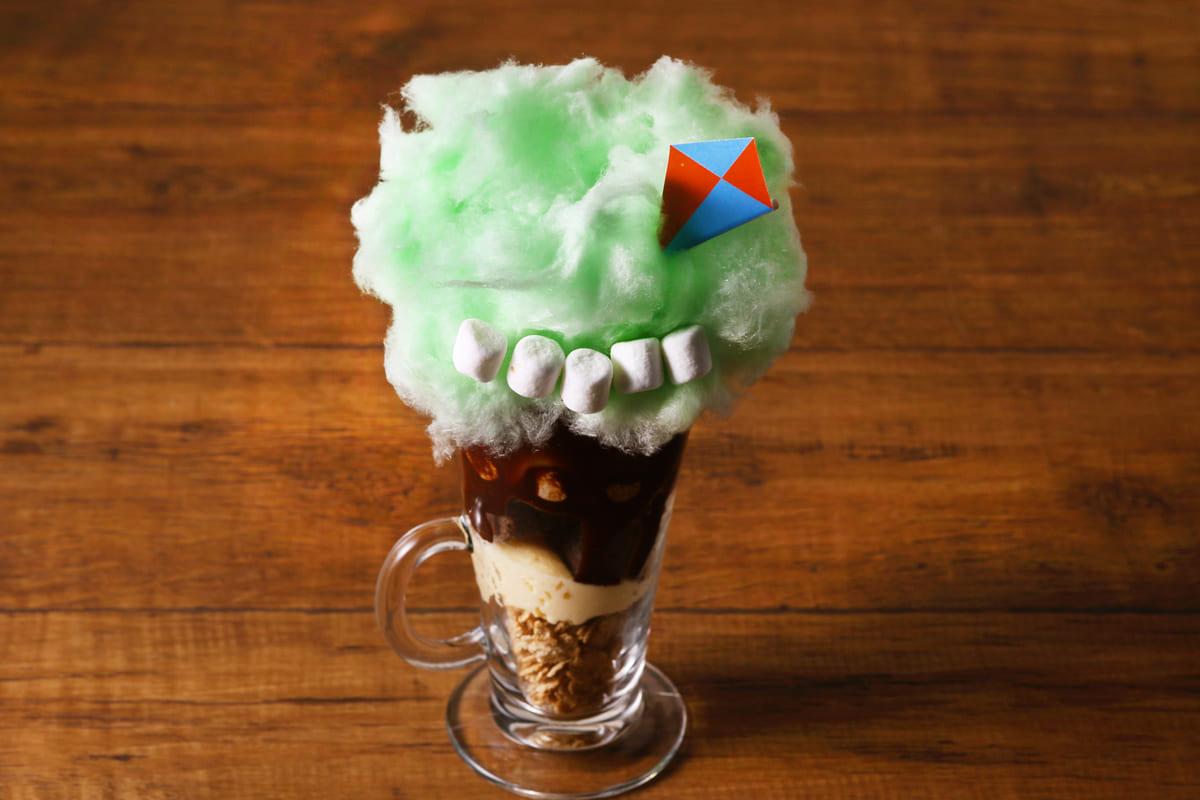 ふわふわのコットンキャンディーには、引っかかった「チャーリー・ブラウン」の凧と、ニヤリと笑った白い歯に見立てたマシュマロがずらり。