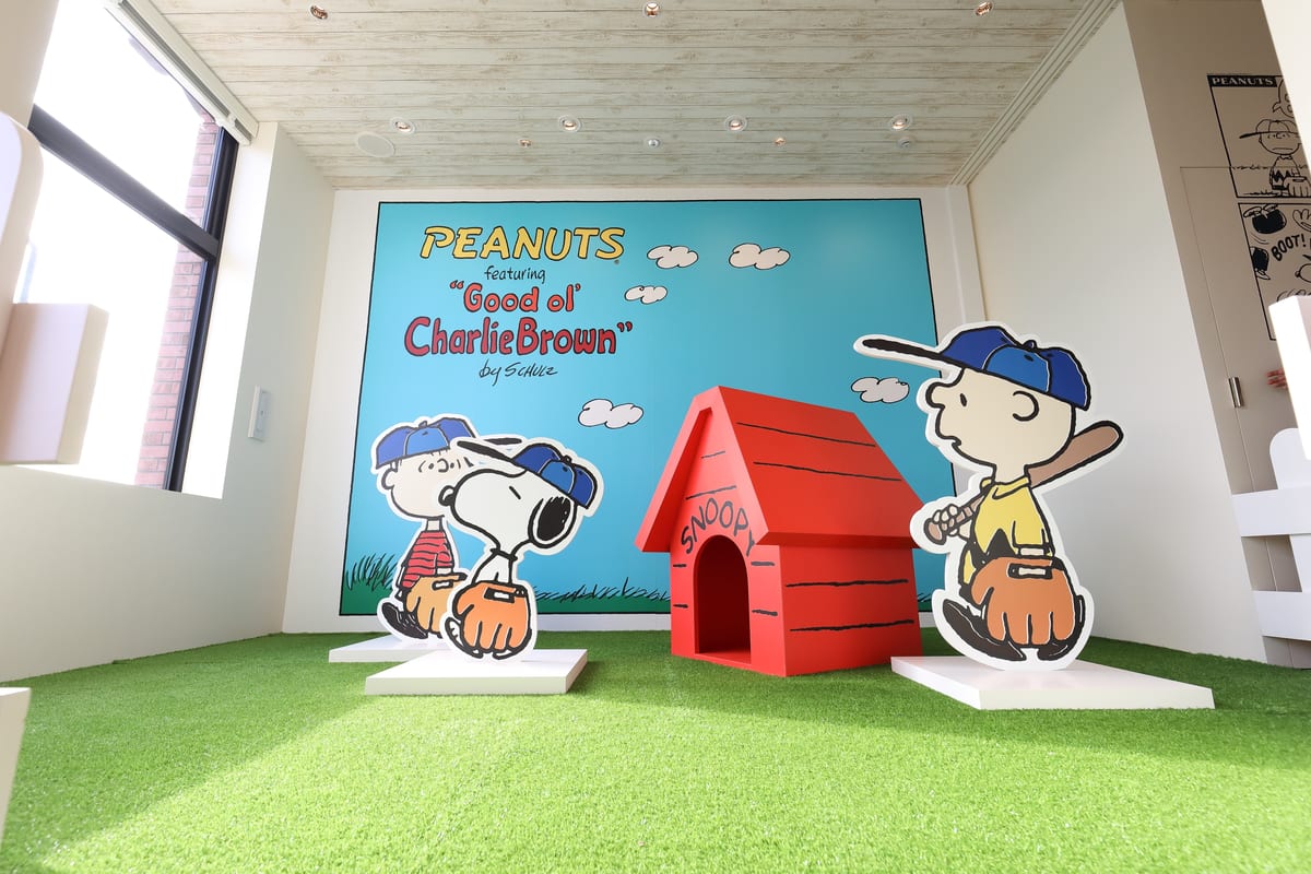 コミックの一場面が壁いっぱいに描かれたメインダイニングや「チャーリー・ブラウン」家の庭を再現したプレイルームで『PEANUTS』の世界を満喫できるコラボカフェ&ダイナーです。