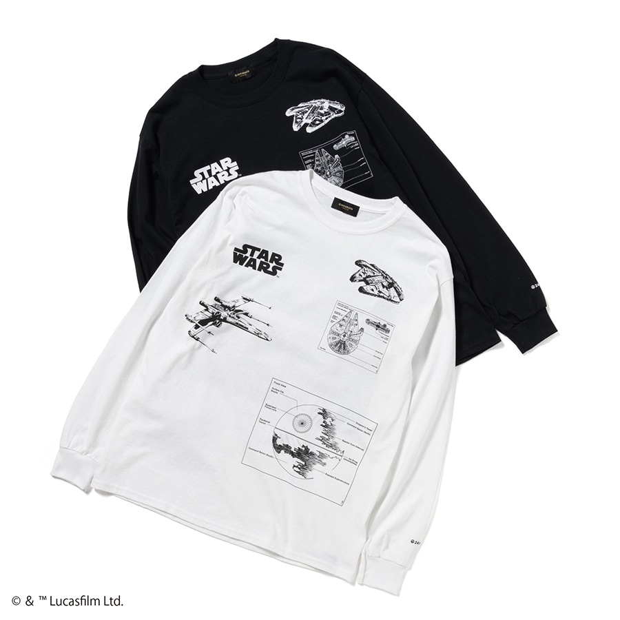 宇宙船「ミレニアム・ファルコン」や「Xウイング・スターファイター」などのテクノロジーがデザインされたロングスリーブTシャツ。