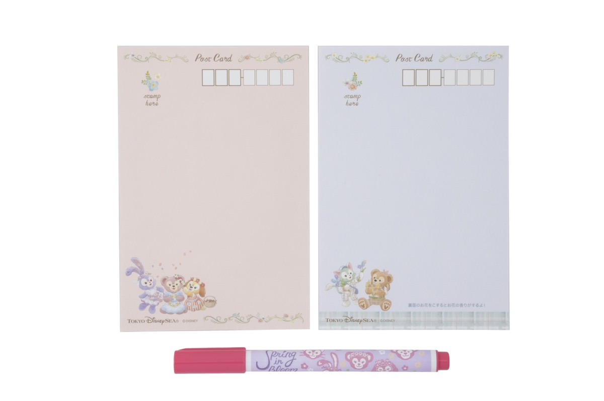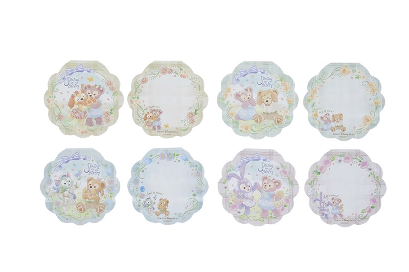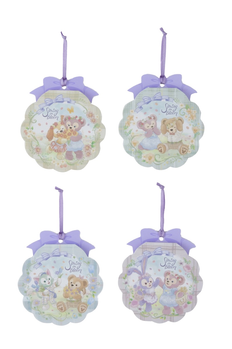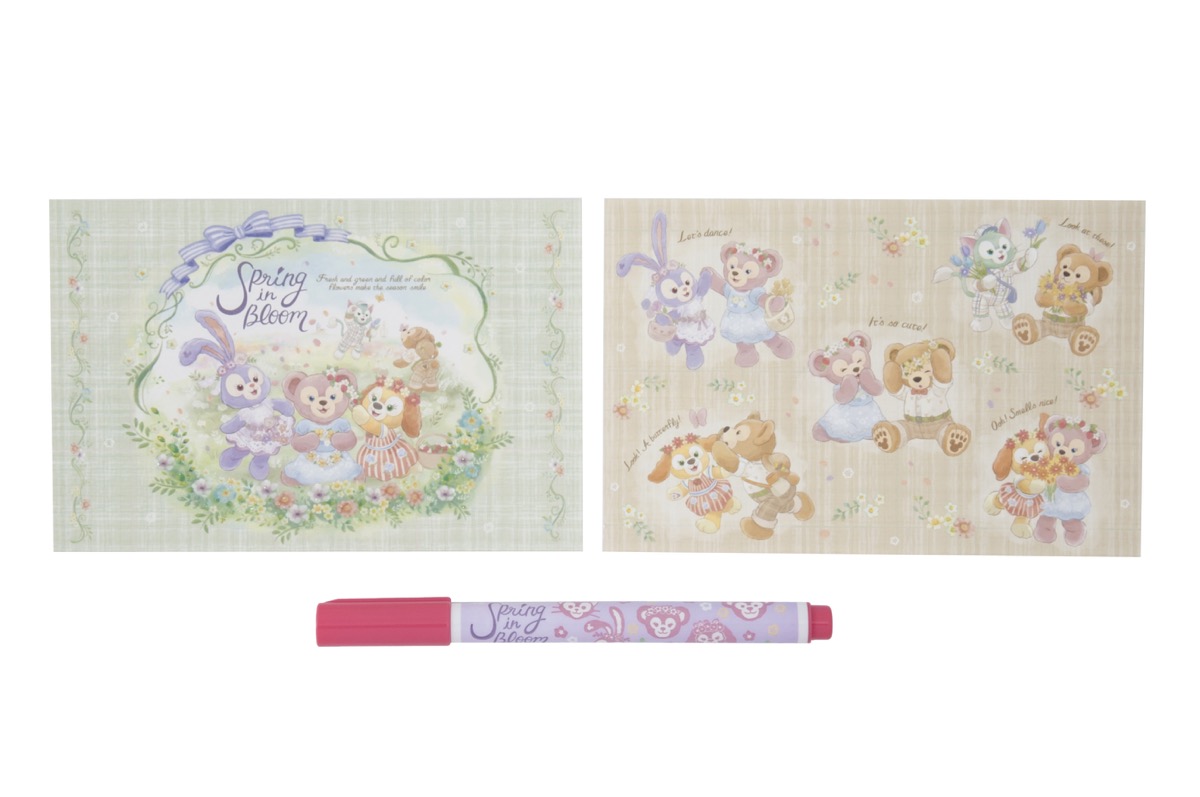 「ダッフィー」「シェリーメイ」「ジェラトーニ」「ステラ・ルー」「クッキー・アン」が春を楽しむデザイン。