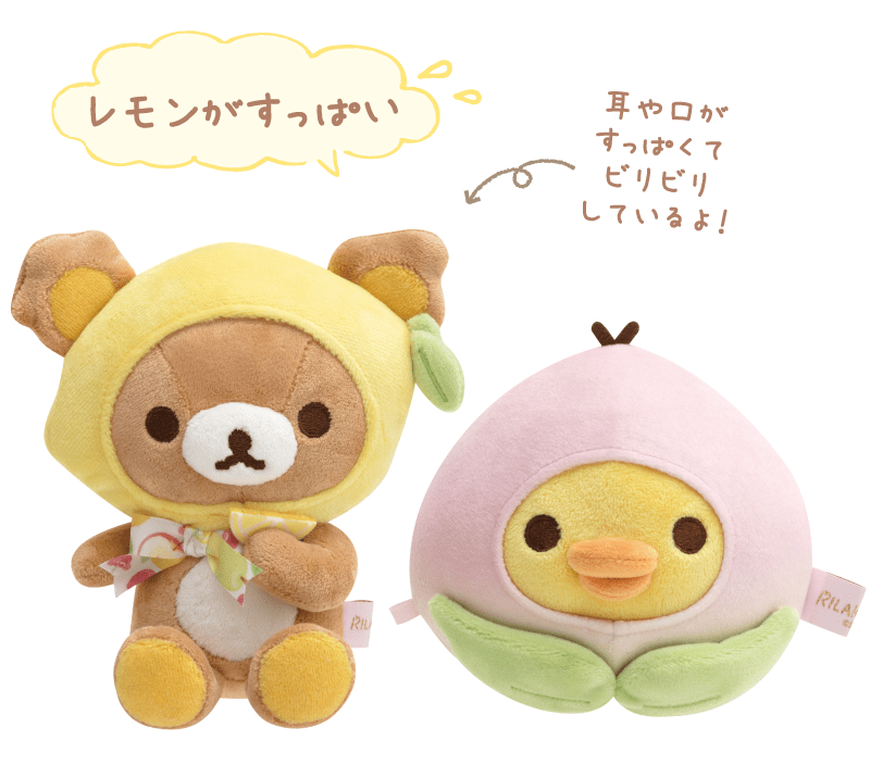「リラックマ」がレモン「キイロイトリ」が桃になりきった、なかよしぬいぐるみ。