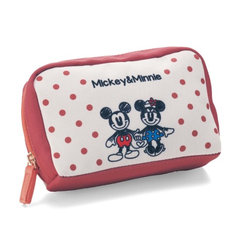 「ミッキーマウス」と「ミニーマウス」がデザインされたピンクのポーチ。