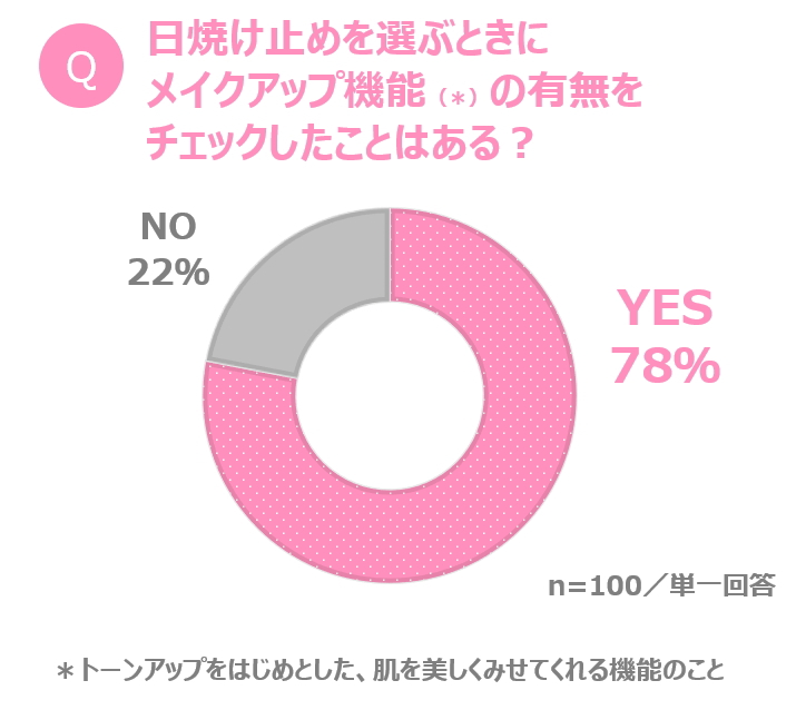 具体的にどのようなポイントをチェックしているかを探ったところ、約8割(78%)の女子中高生が、日焼け止め選びの際に「メイクアップ機能の有無をチェックしたことがある」と答えました。
